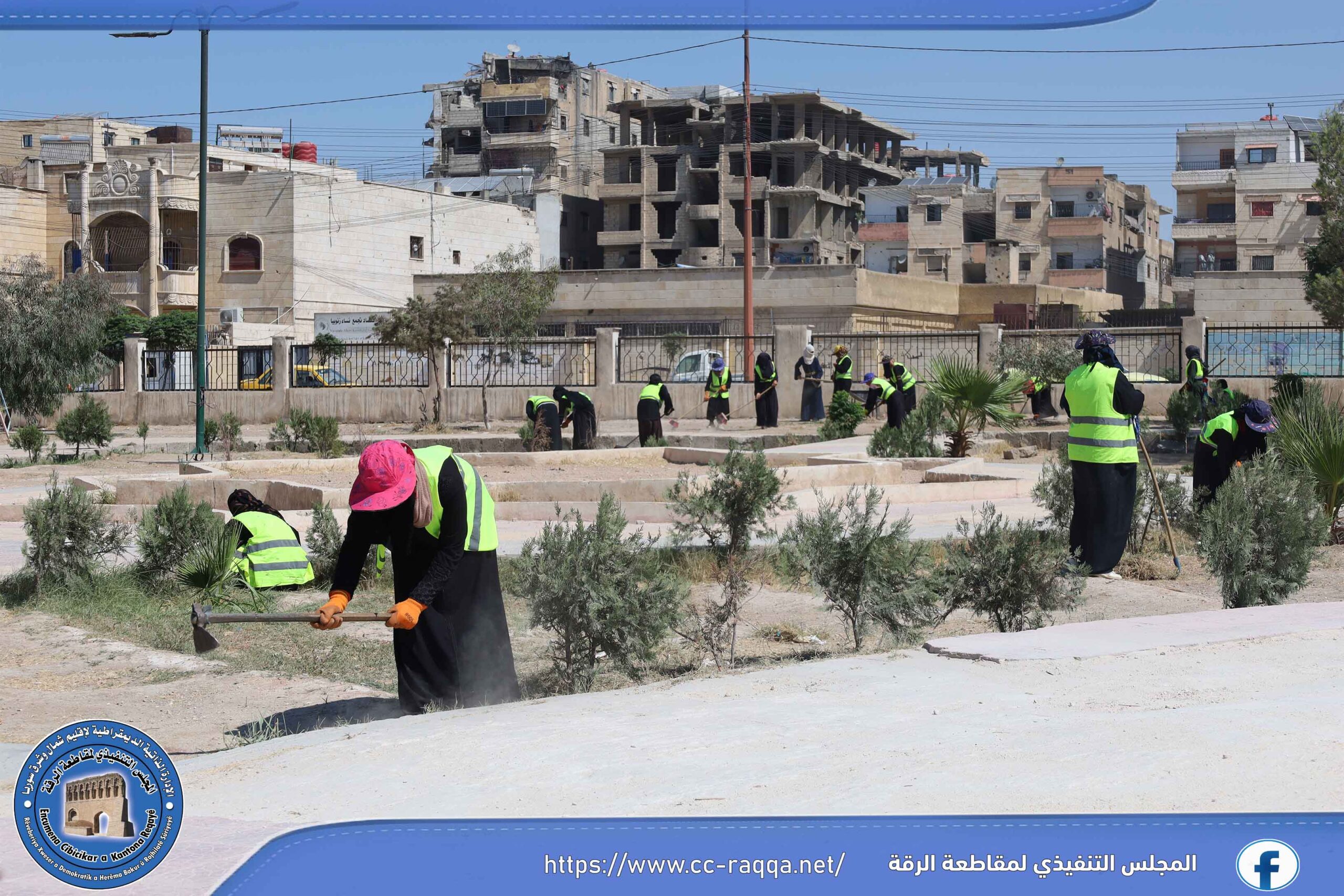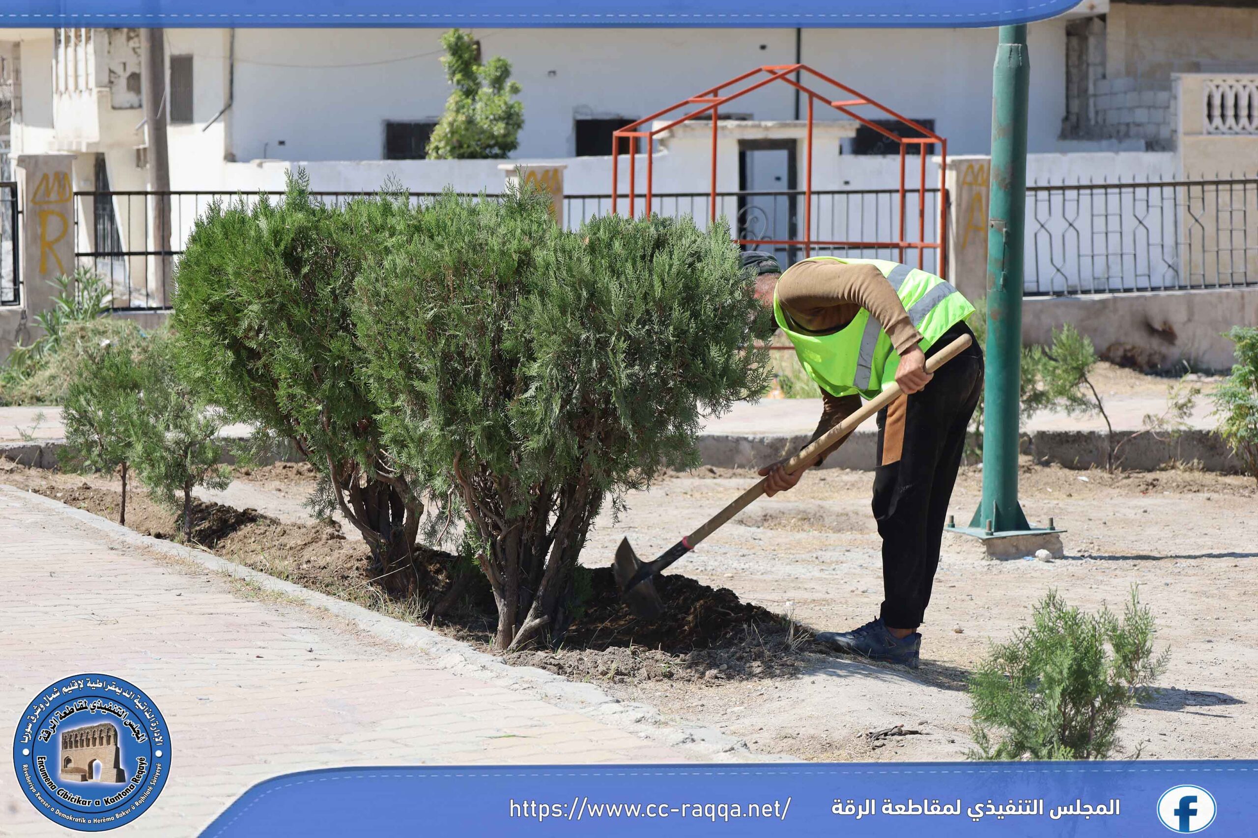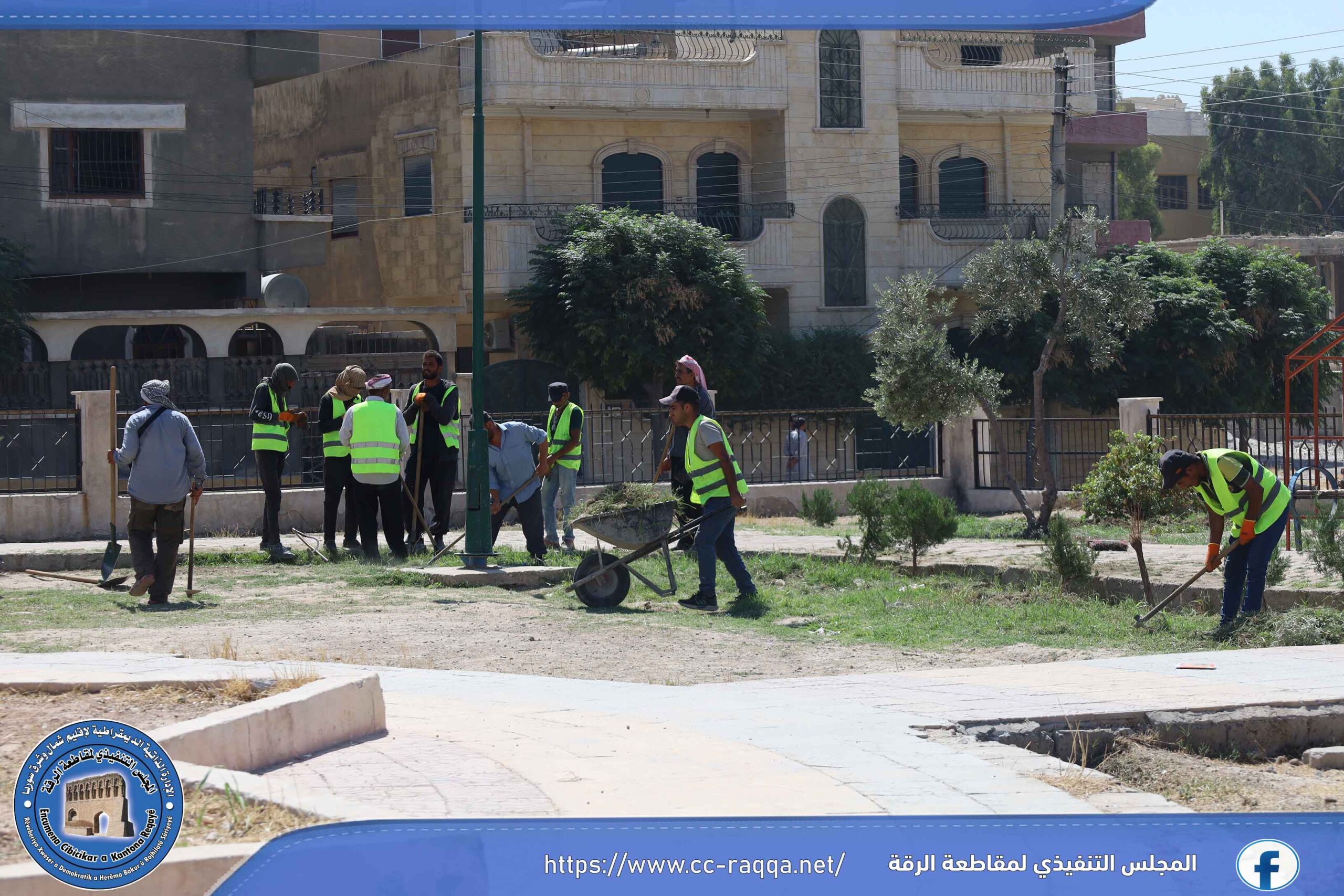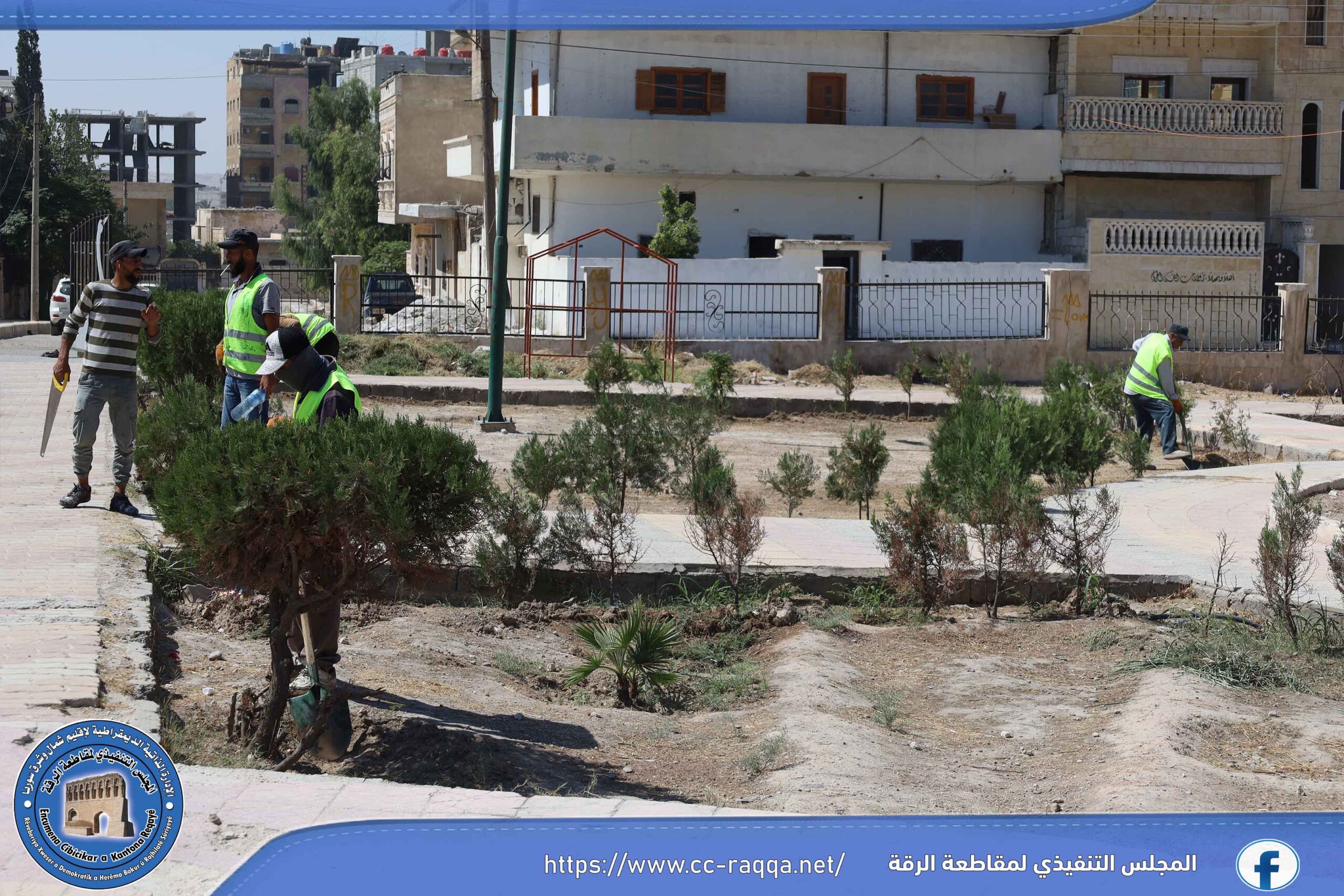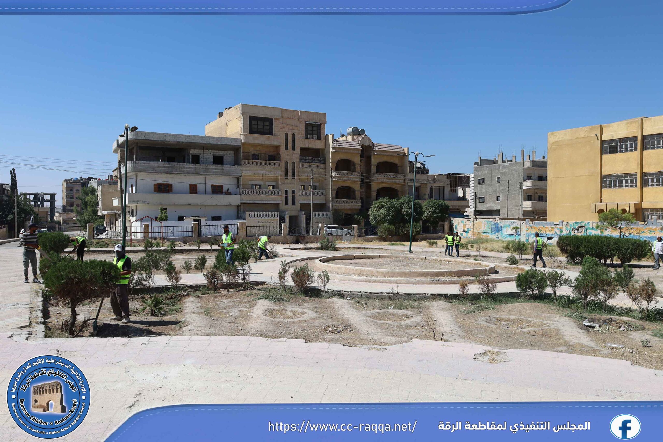 تقوم الورشات التابعة لدائرة الحدائق والتشجير والتابعة لبلدية الشعب في الرقة صباح اليوم 4 أيلول، على إجراء عمليات التنظيف وإزالة الأعشاب الضارة في حديقة جواد أنزور، بهدف إضافة رونق جمالي للمدينة.