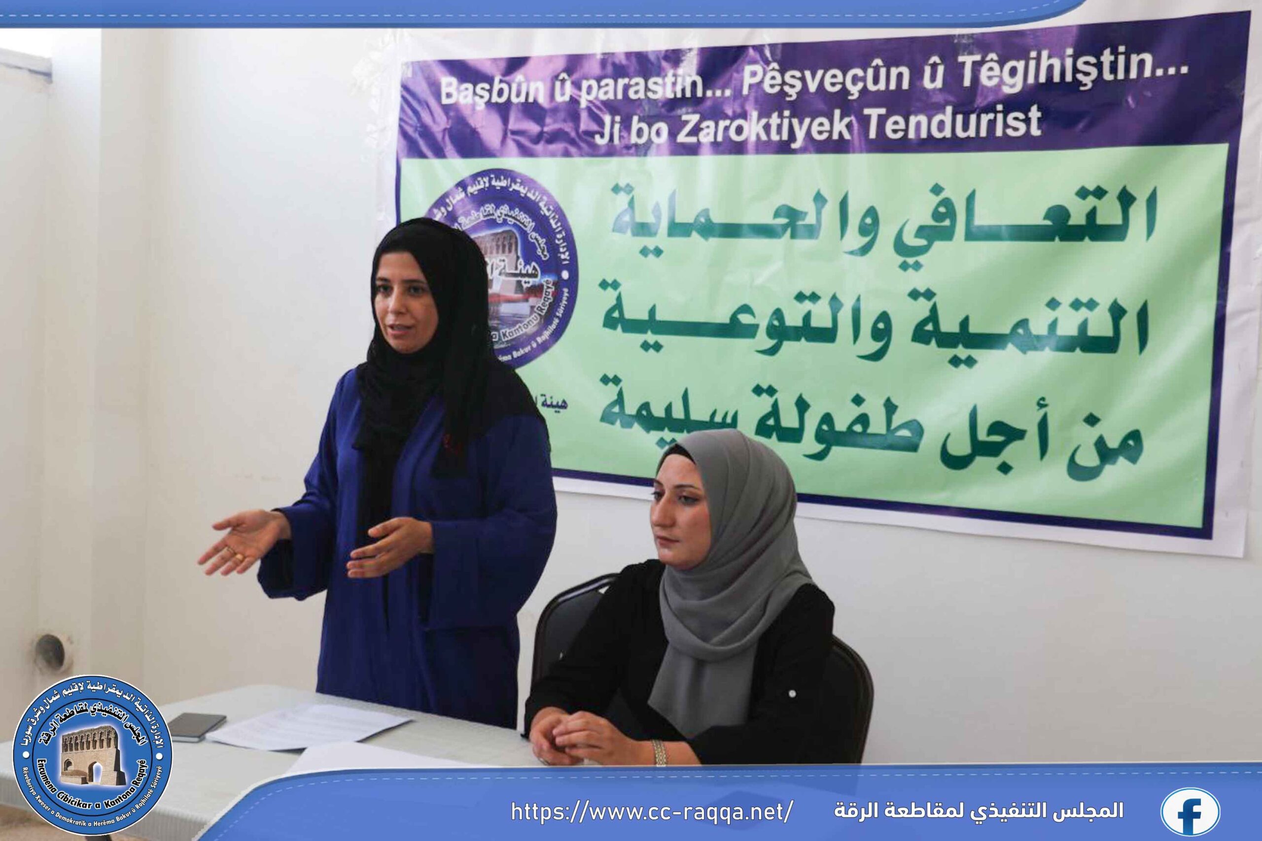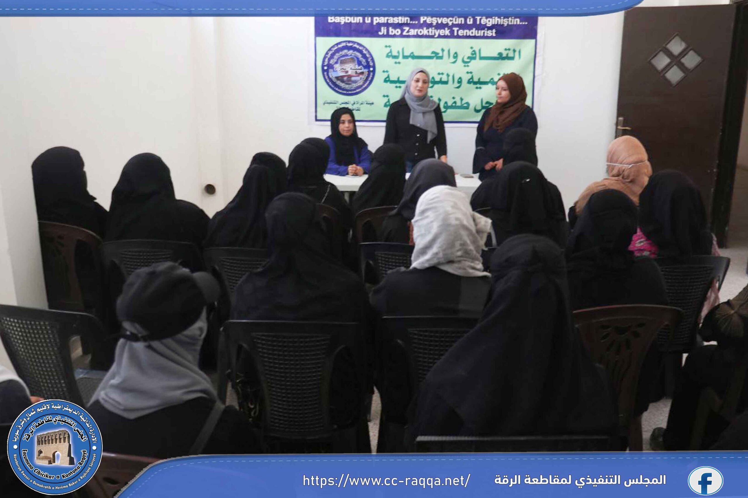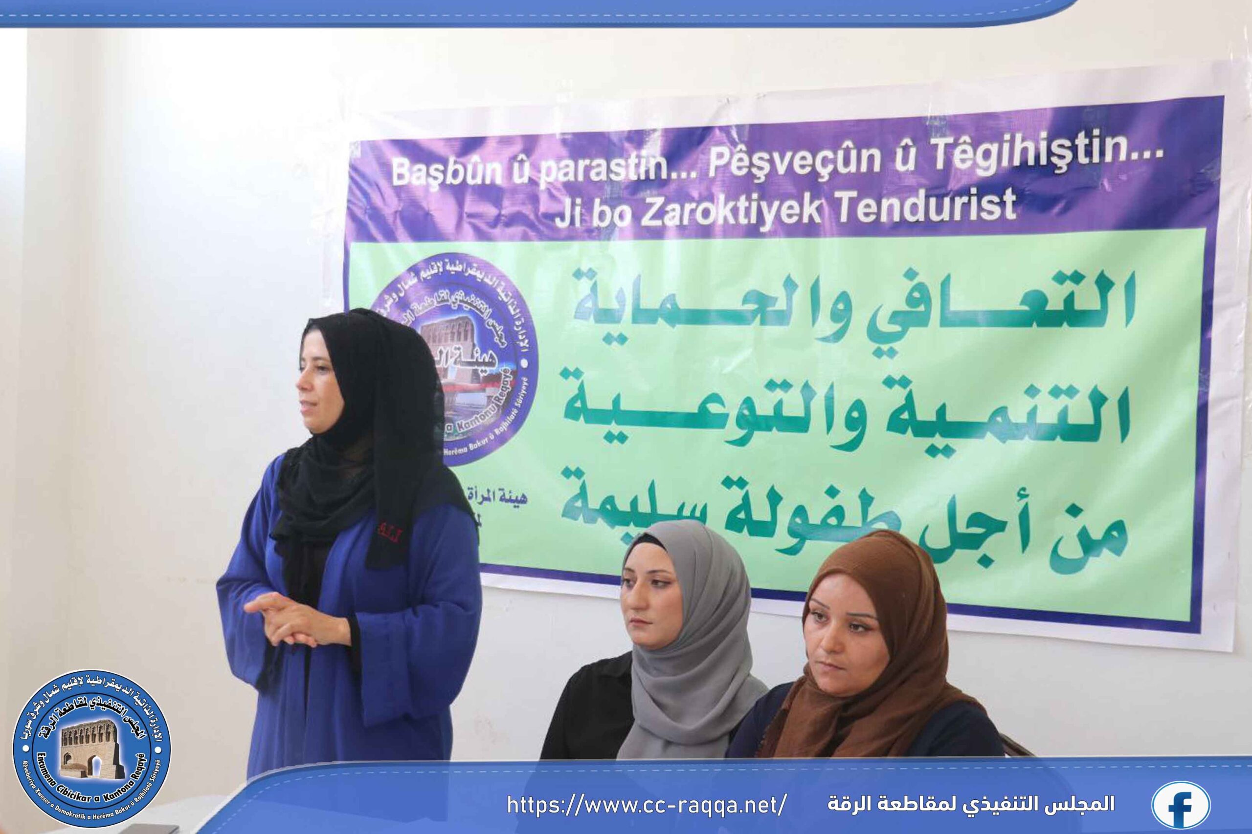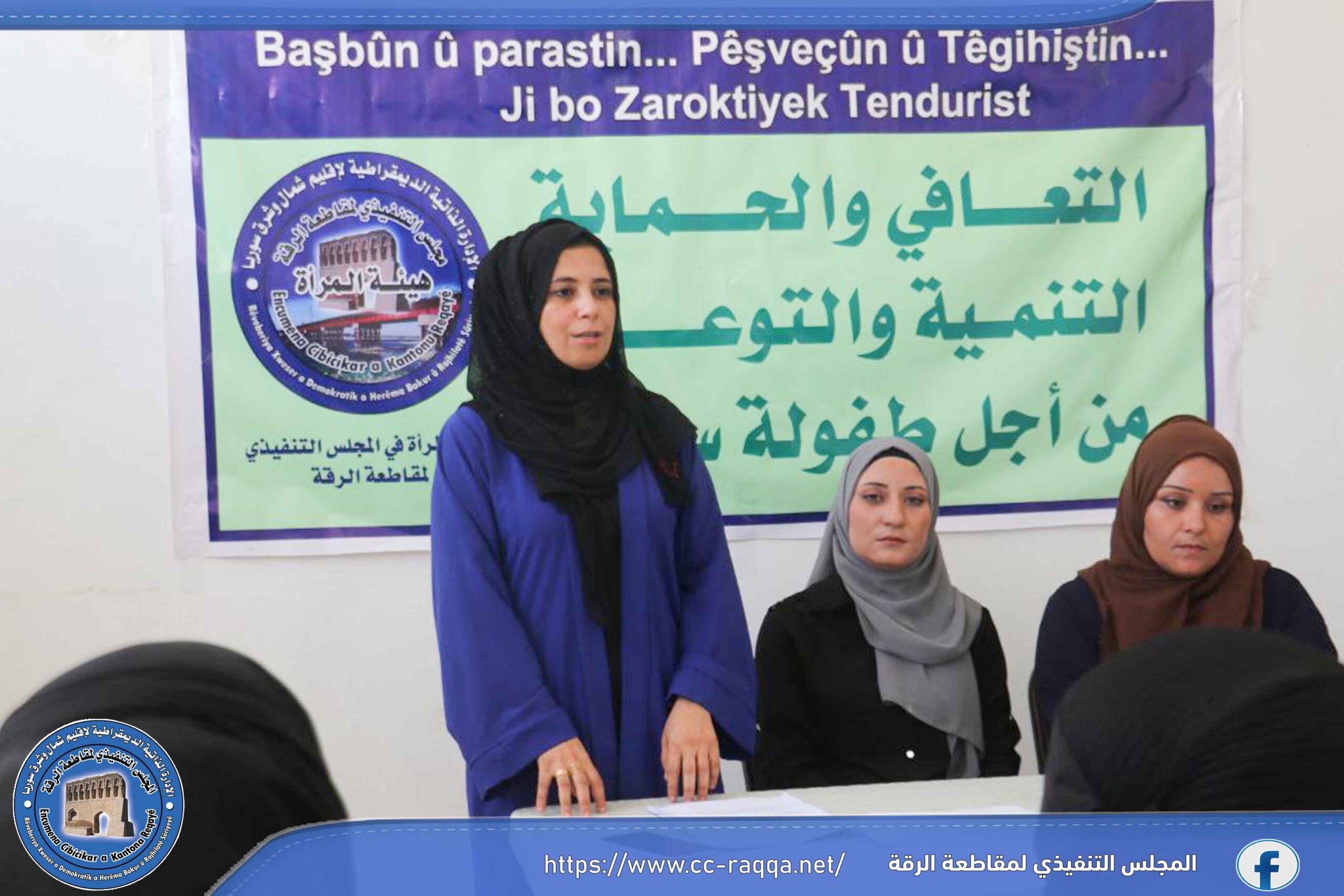 تحت شعار (التعافي والحماية … التنمية والتوعية … من آجل طفولة سليمة)، وضمن فعاليات الحملة التي أطلقتها هيئة المرأة لشمال وشرق سوريا، نظم مكتب حماية الطفل التابع لهيئة المرأة في مقاطعة الرقة صباح اليوم ٣ أيلول، محاضرة شملت العديد من النساء والأمهات، بهدف التعريف بقانون الطفل، والمشاكل والصعوبات التي يتعرض لها الأطفال، والظواهر السلبية المنتشرة بين الأطفال، من تعاطي المخدرات والتسول وتسرب الأطفال من المدرس وزواج القاصرات والعنف الأسري.