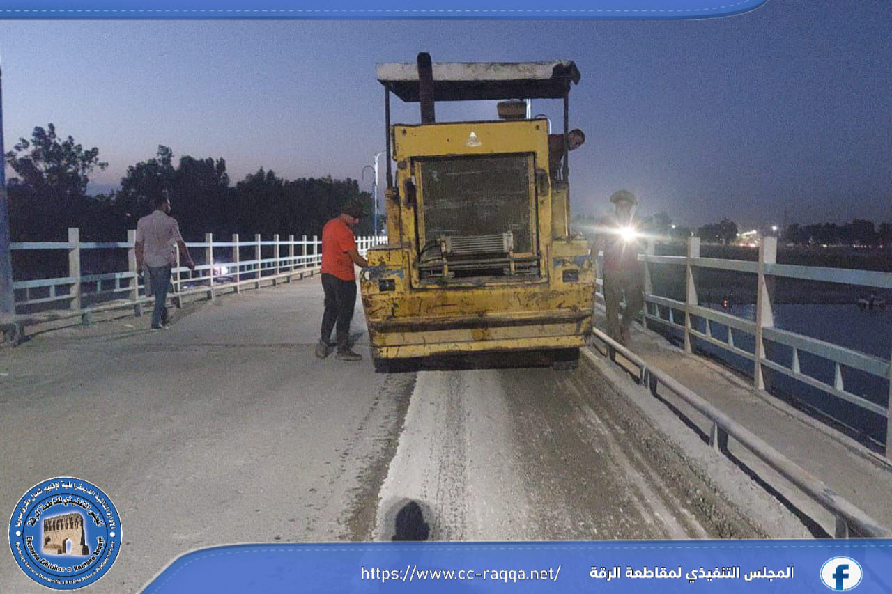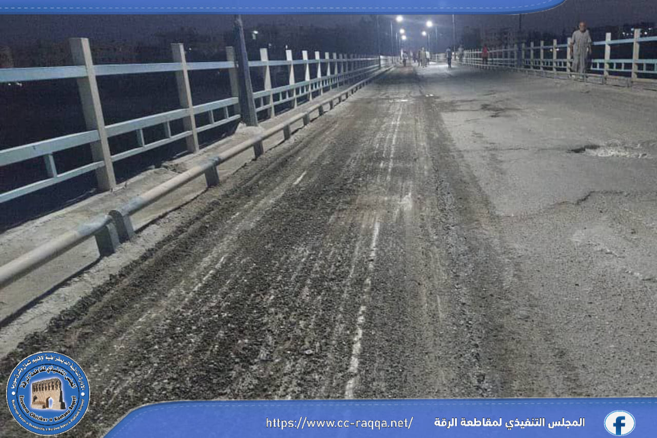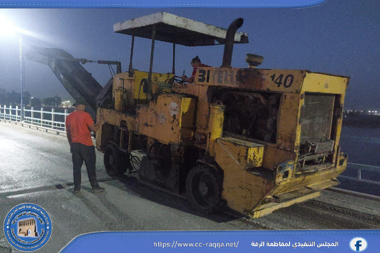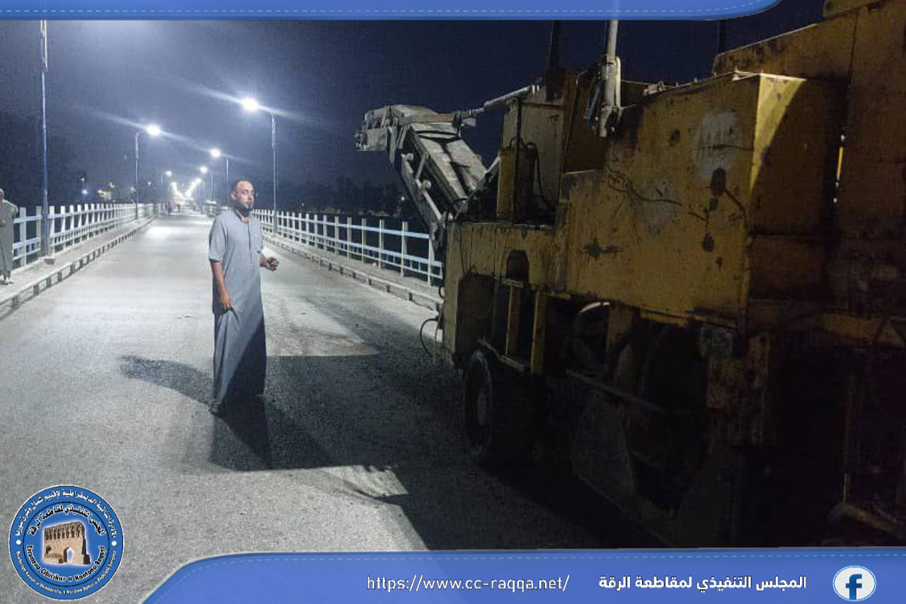 باشرت الورشات التابعة لبلدية الشعب في الرقة مساء أمس 5 أيلول، بإجراء عمليات قشط الإسفلت المتضرر لموقع لجسر القديم، والذي يبلغ طوله 670 متر وعرض 6.5 متر، ليتم فيما بعد رشه بماده R.C ومده بمادة المجبول الإسفلتي.