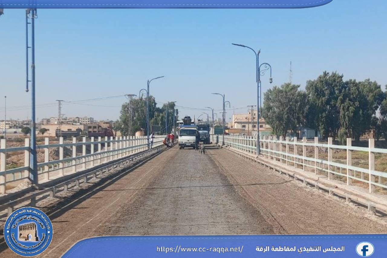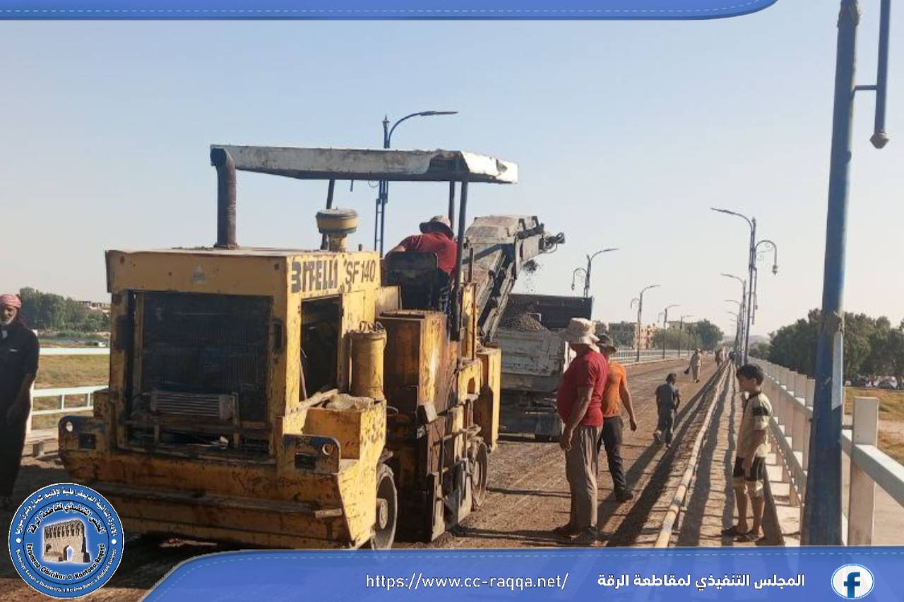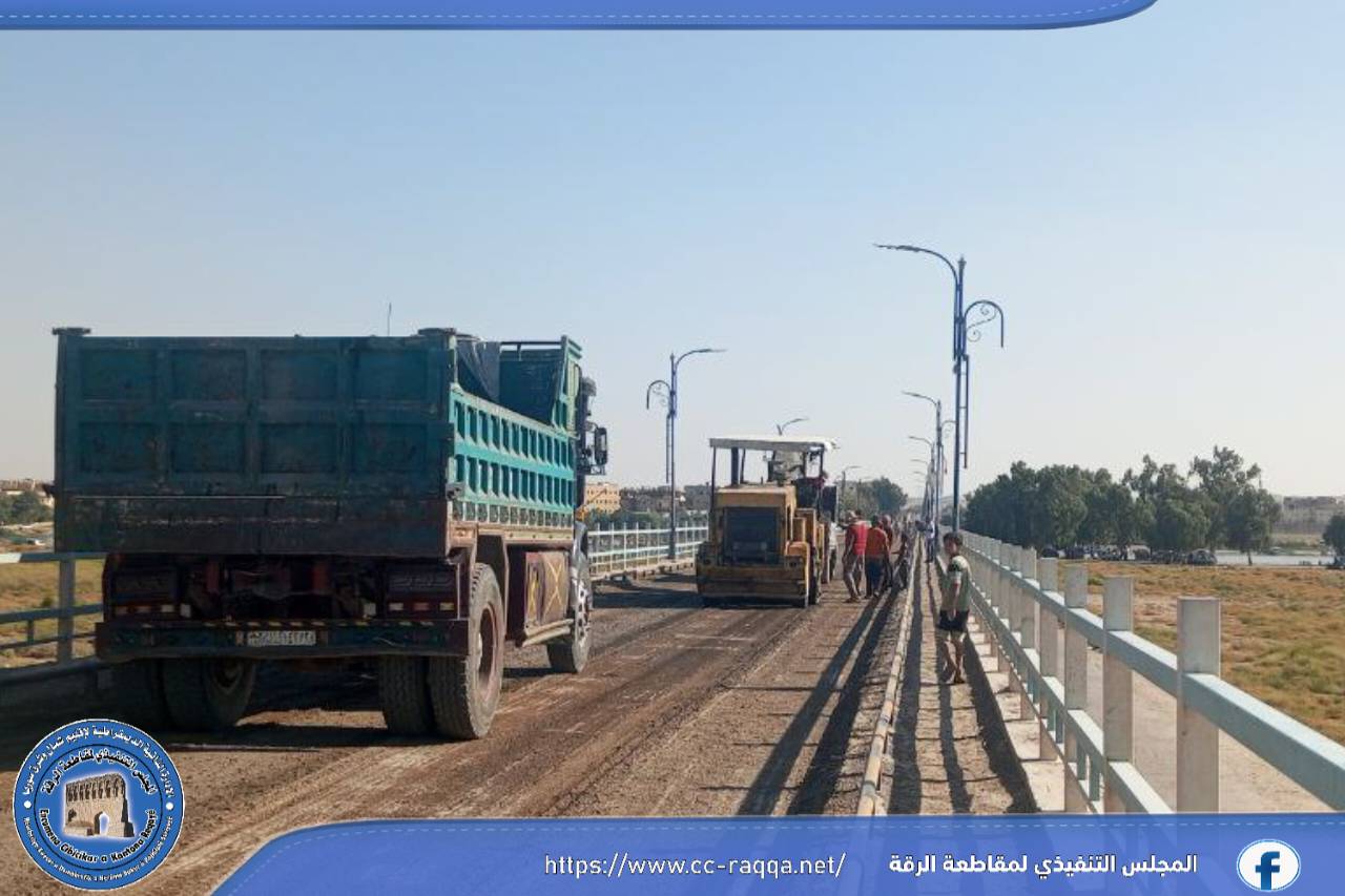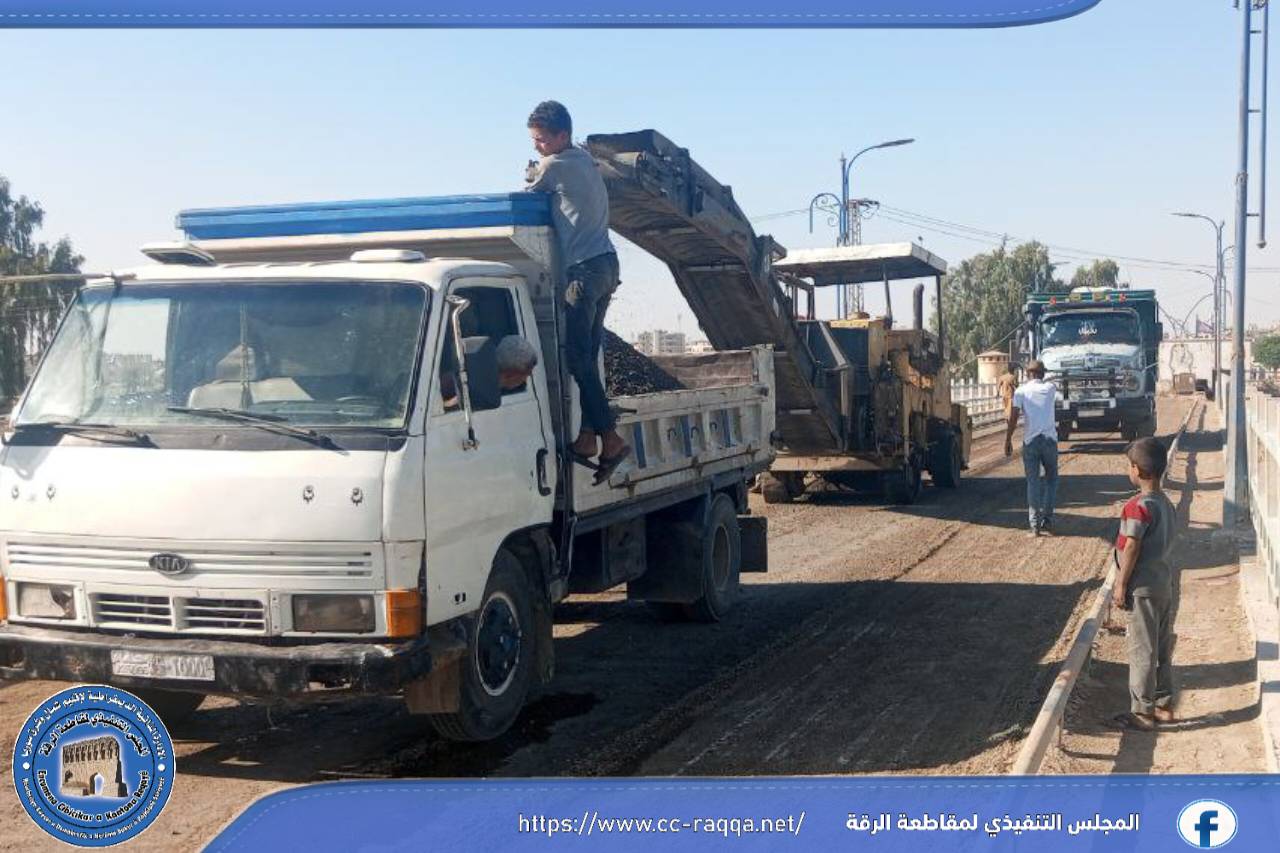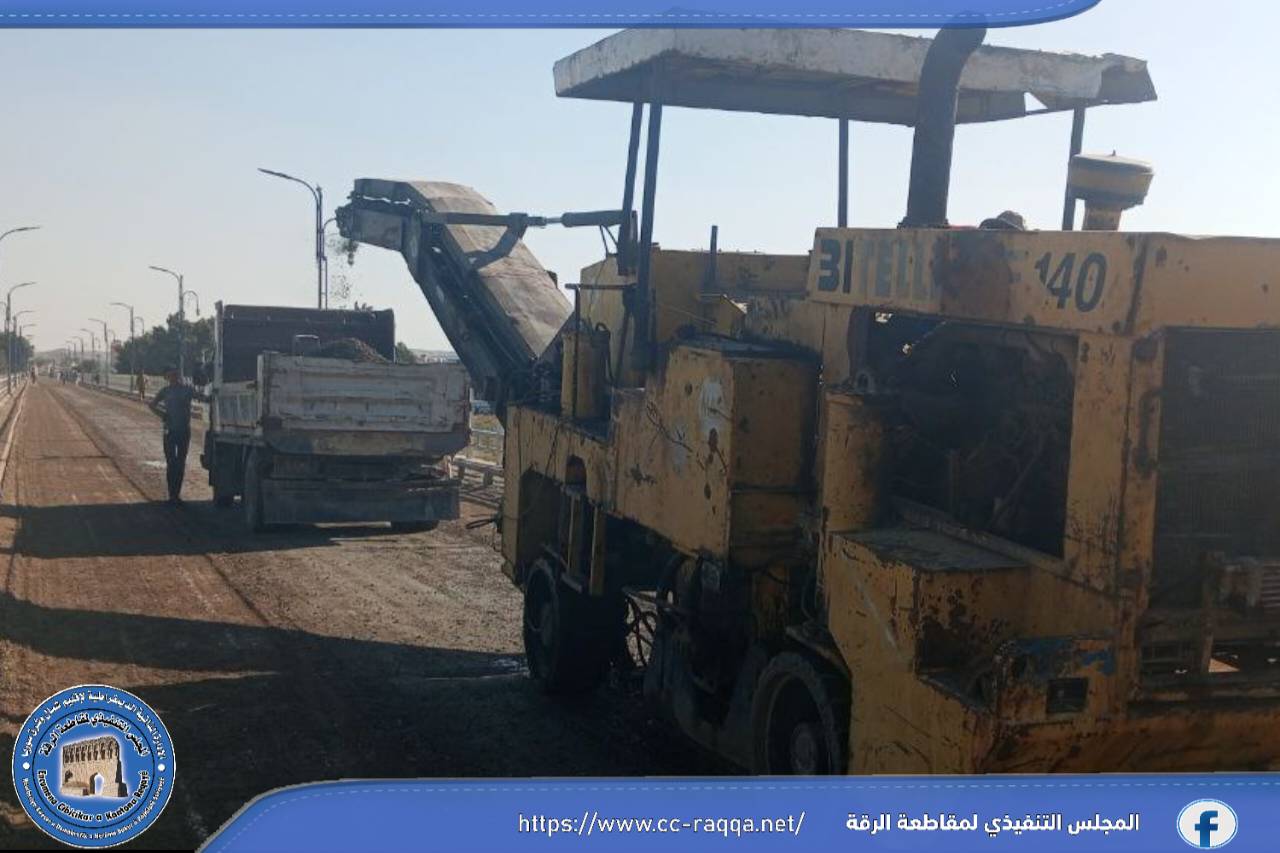 لليوم الثاني على التوالي، تواصل الورشات التابعة لبلدية الشعب في الرقة، إجراء عمليات قشط الإسفلت المتضرر لموقع لجسر القديم، والذي يبلغ طوله 670 متر وعرض 6.5 متر، ليتم فيما بعد رشه بمادة R.C ومده بمادة المجبول الإسفلتي.