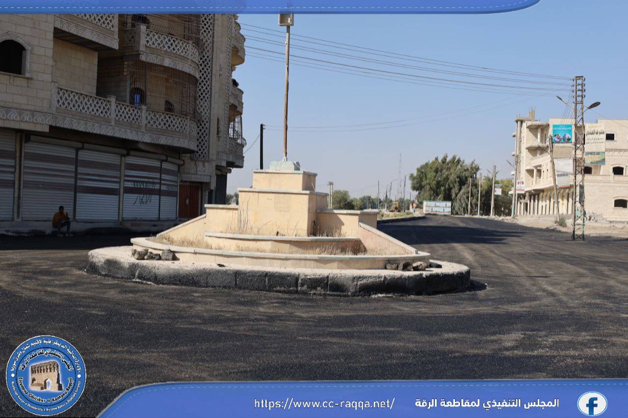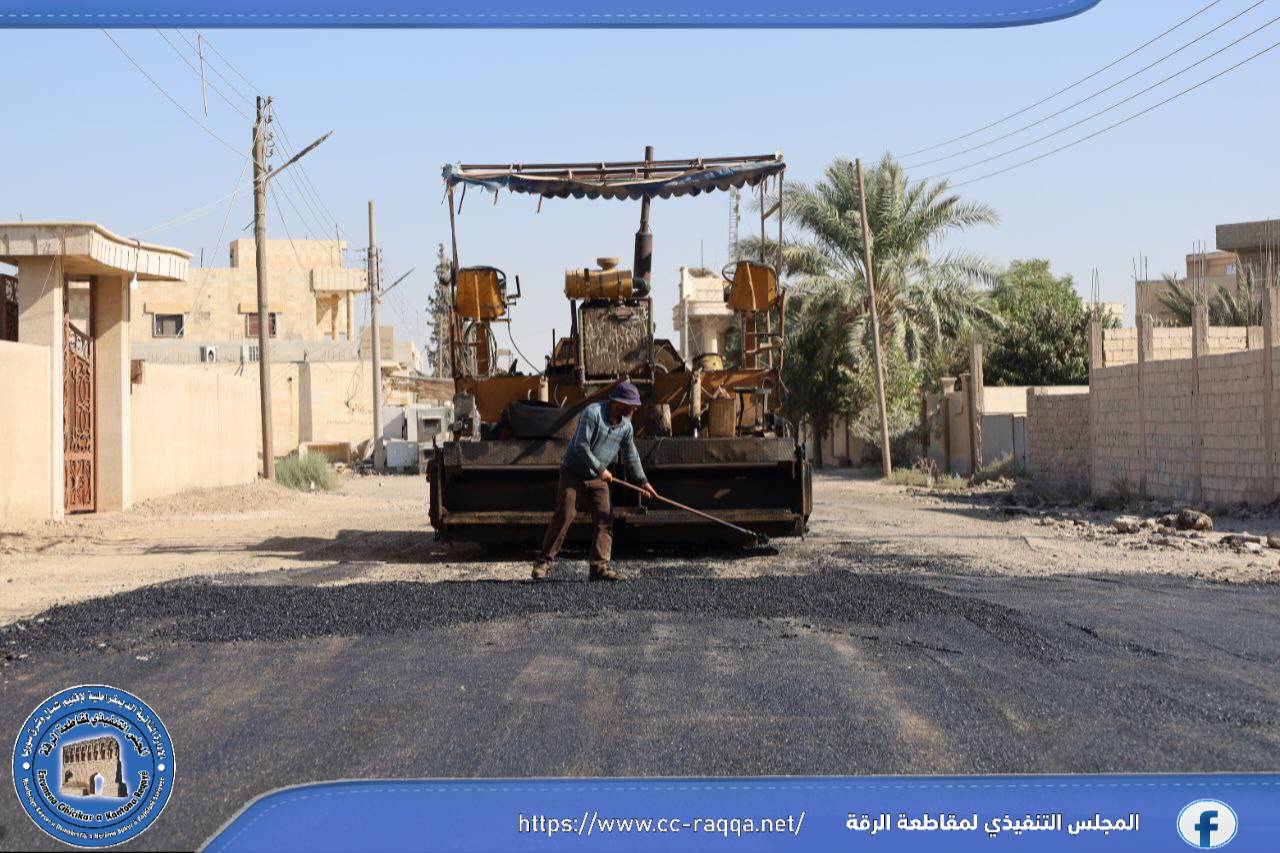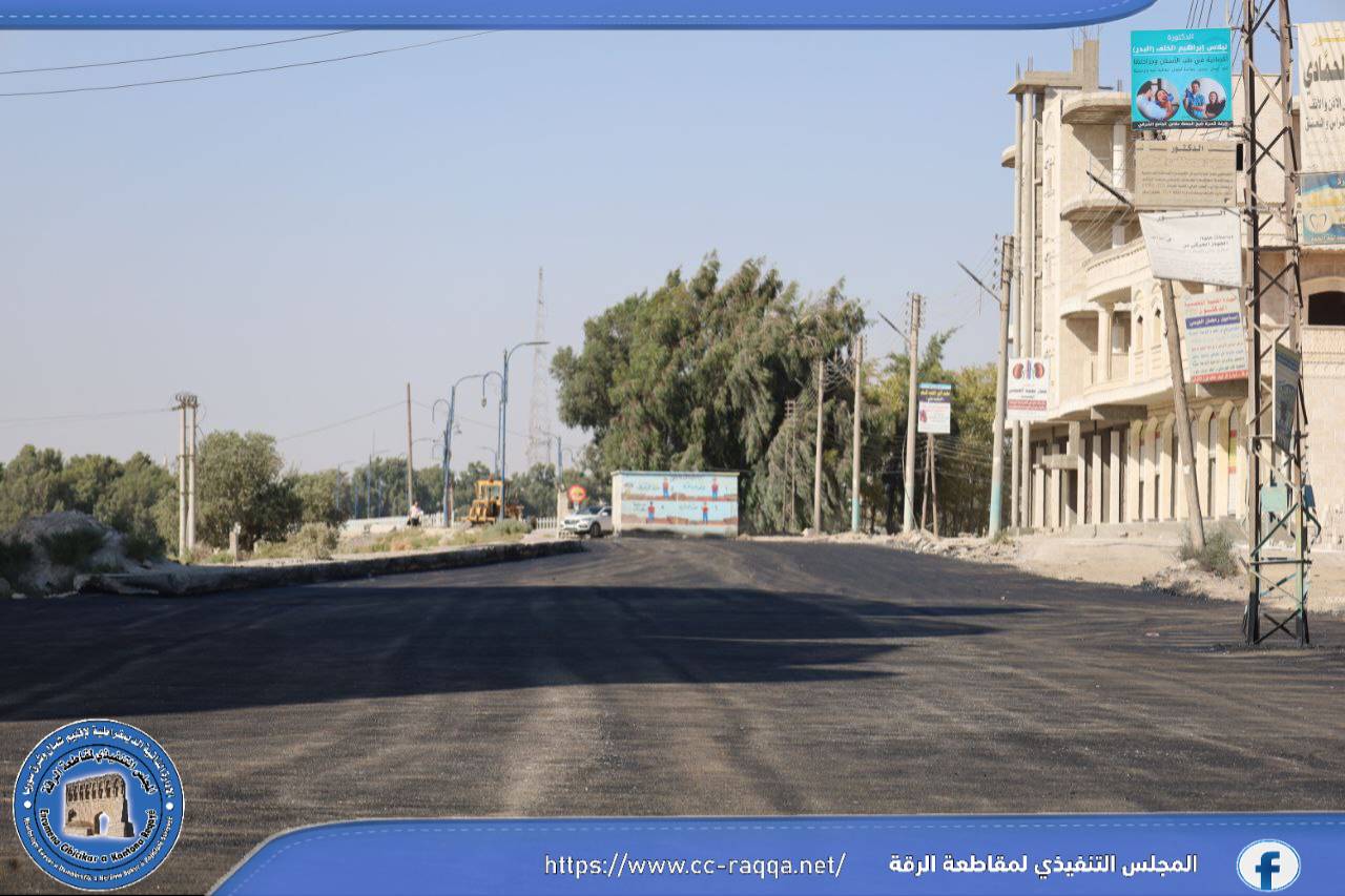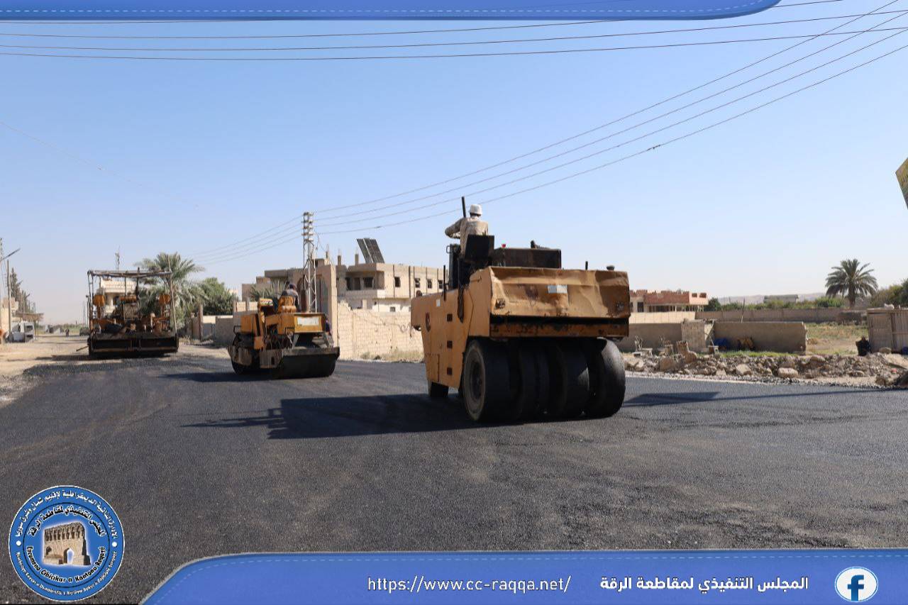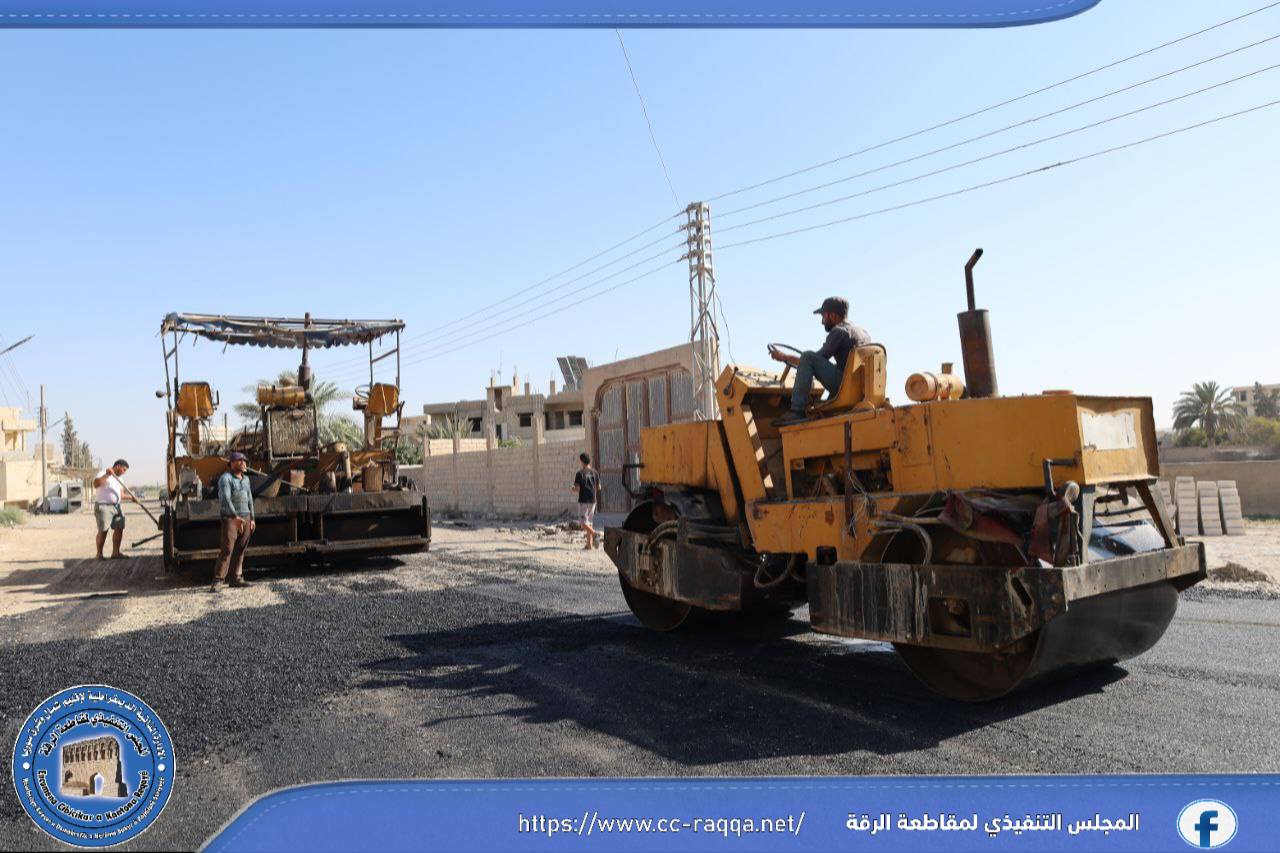 تواصل الورشات التابعة لبلدية الشعب في الرقة عصر اليوم ١٤ أيلول، أعمال تعبيد الطرف الجنوبي من الجسر القديم، وذلك بعد إجراء عمليات القشط ومد مادة الكرابية ودحلها ورش مادة الـ MC 0.