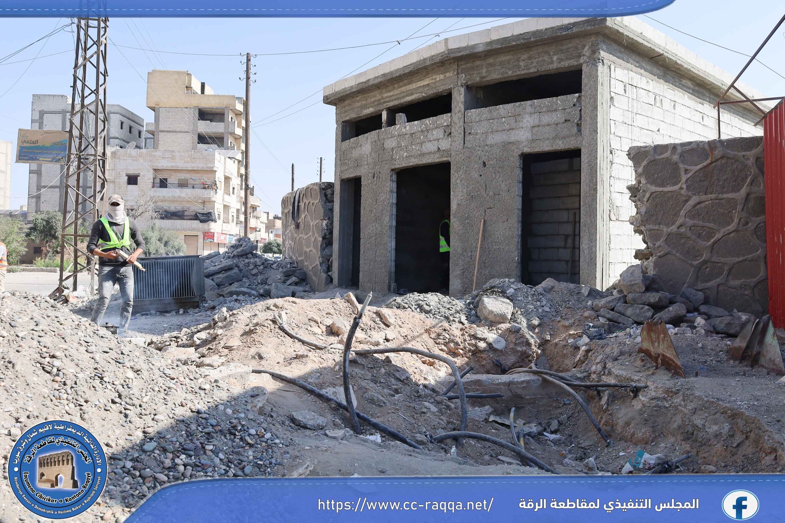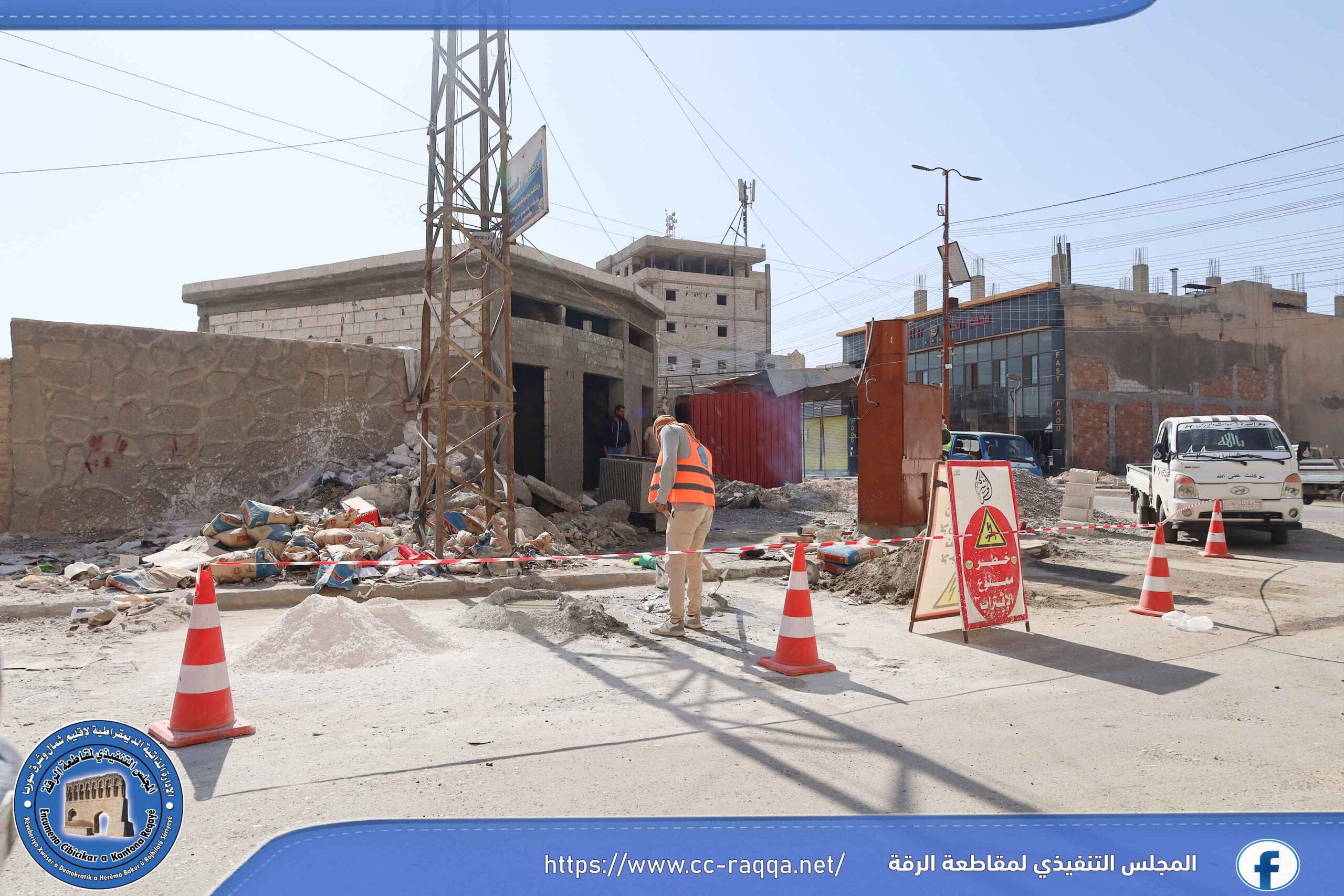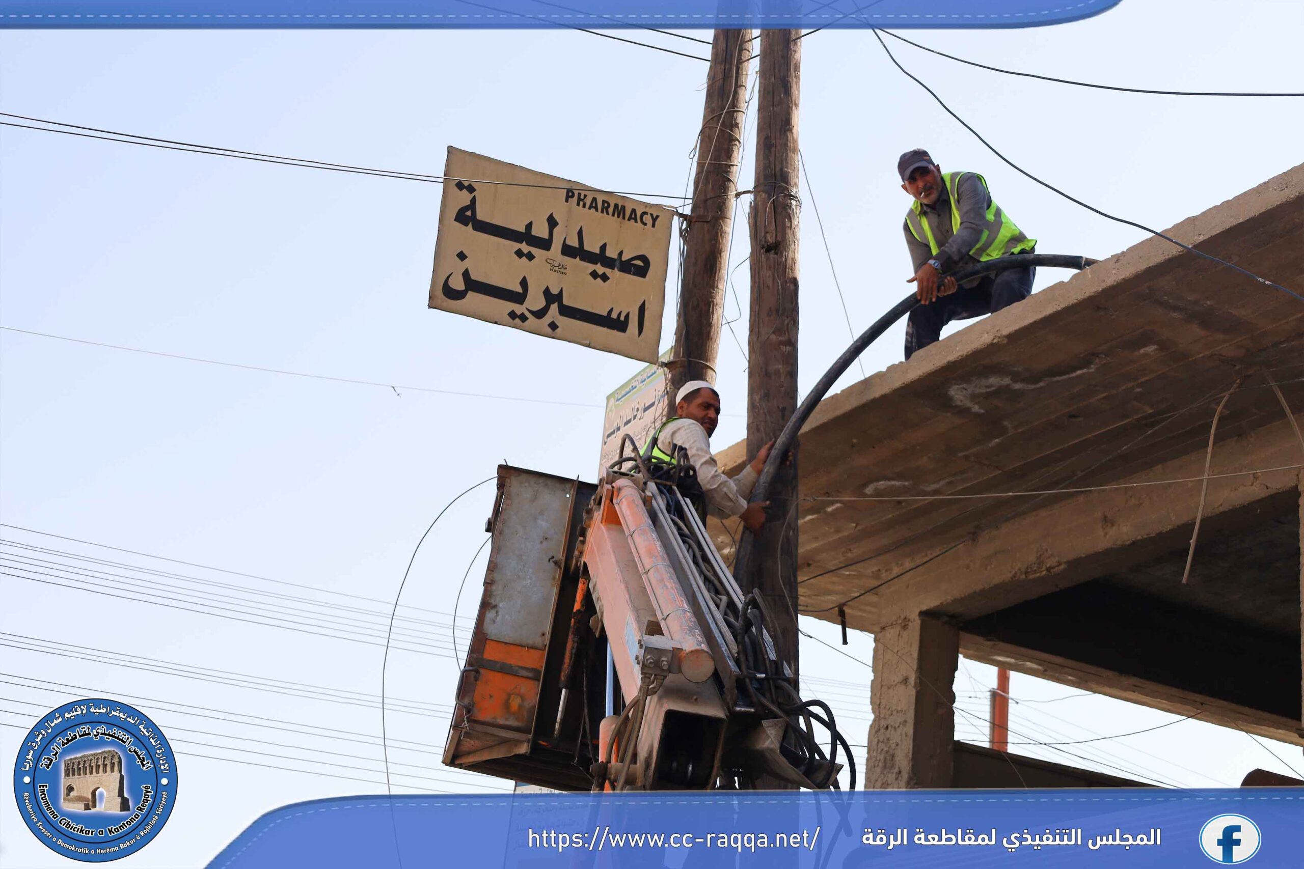 بعد الإنتهاء من فحص الكابلات الرئيسية وتركيب اللوحات الأرضية الرئيسية، والتي يصل عددها إلى ٢٠ لوحة أرضية، تقوم ورشة الكابلات الأرضية التابعة لهيئة الطاقة في مقاطعة الرقة، بالعمل على تركيب كابلات المنيوم معزولة (٤ × ٢٤٠) ملم عدد ٤ طول كل منها ١٥ متر للربط بين الشبكات الهوائية والأرضية، في كل من مركز الرقي والجو خدار.