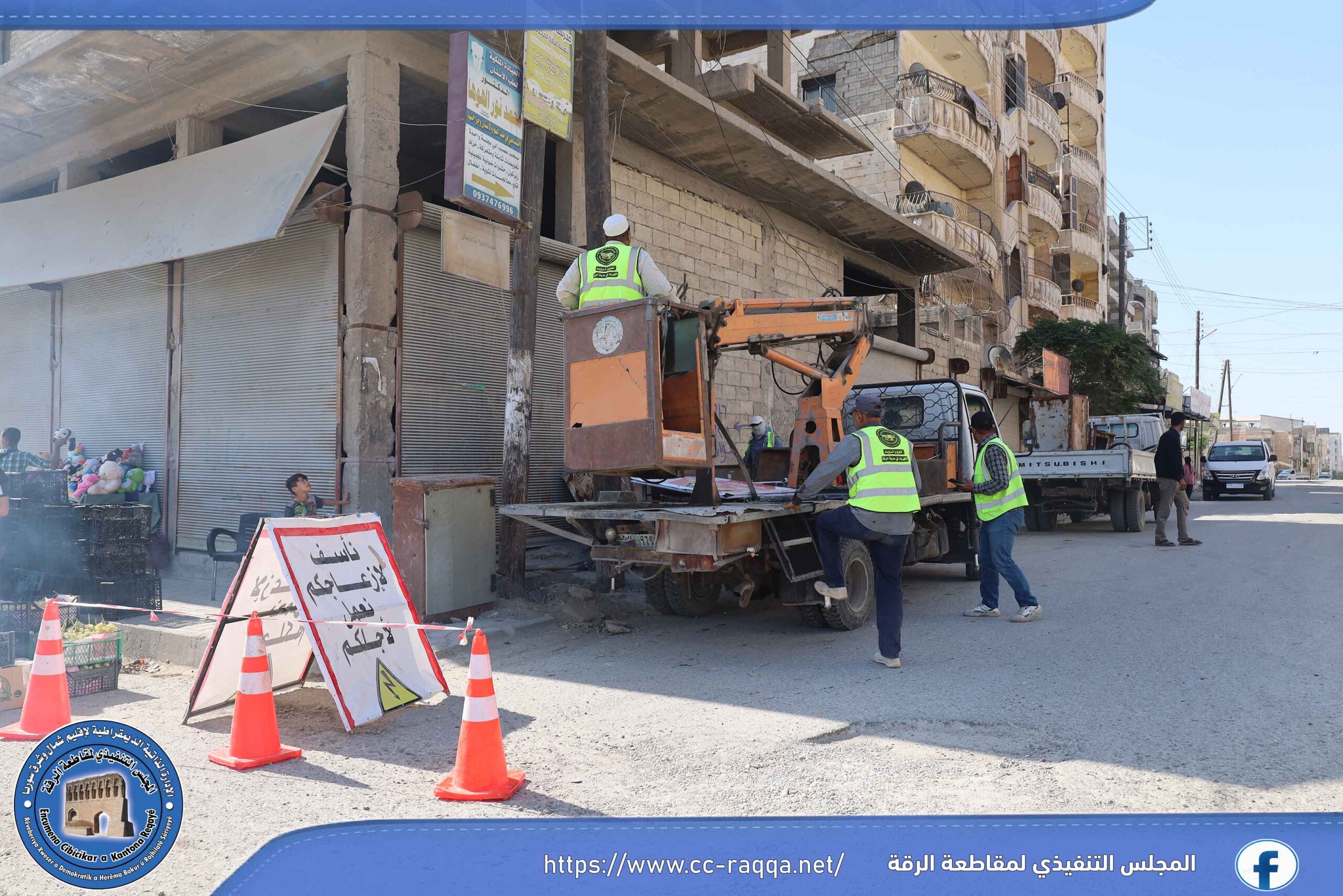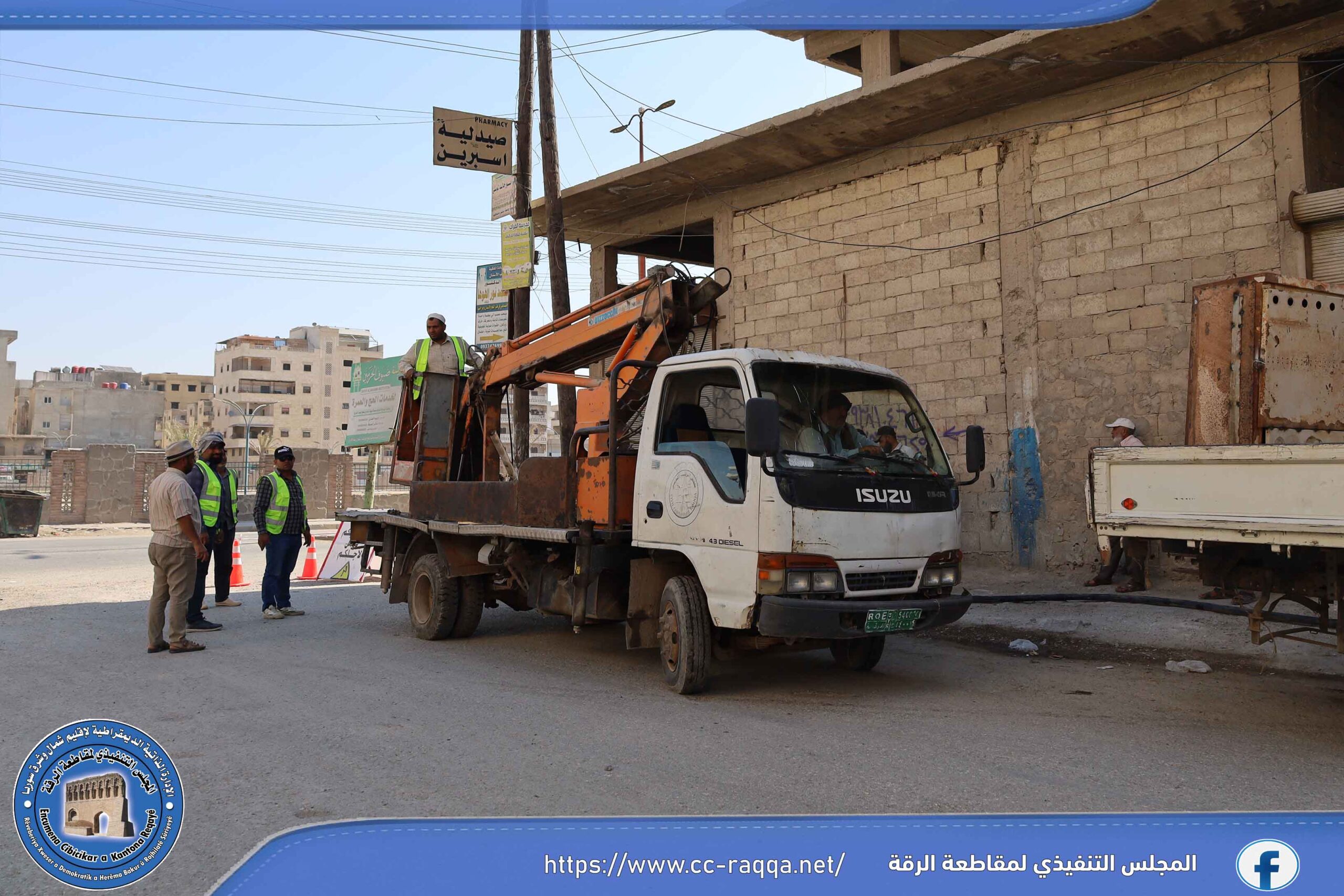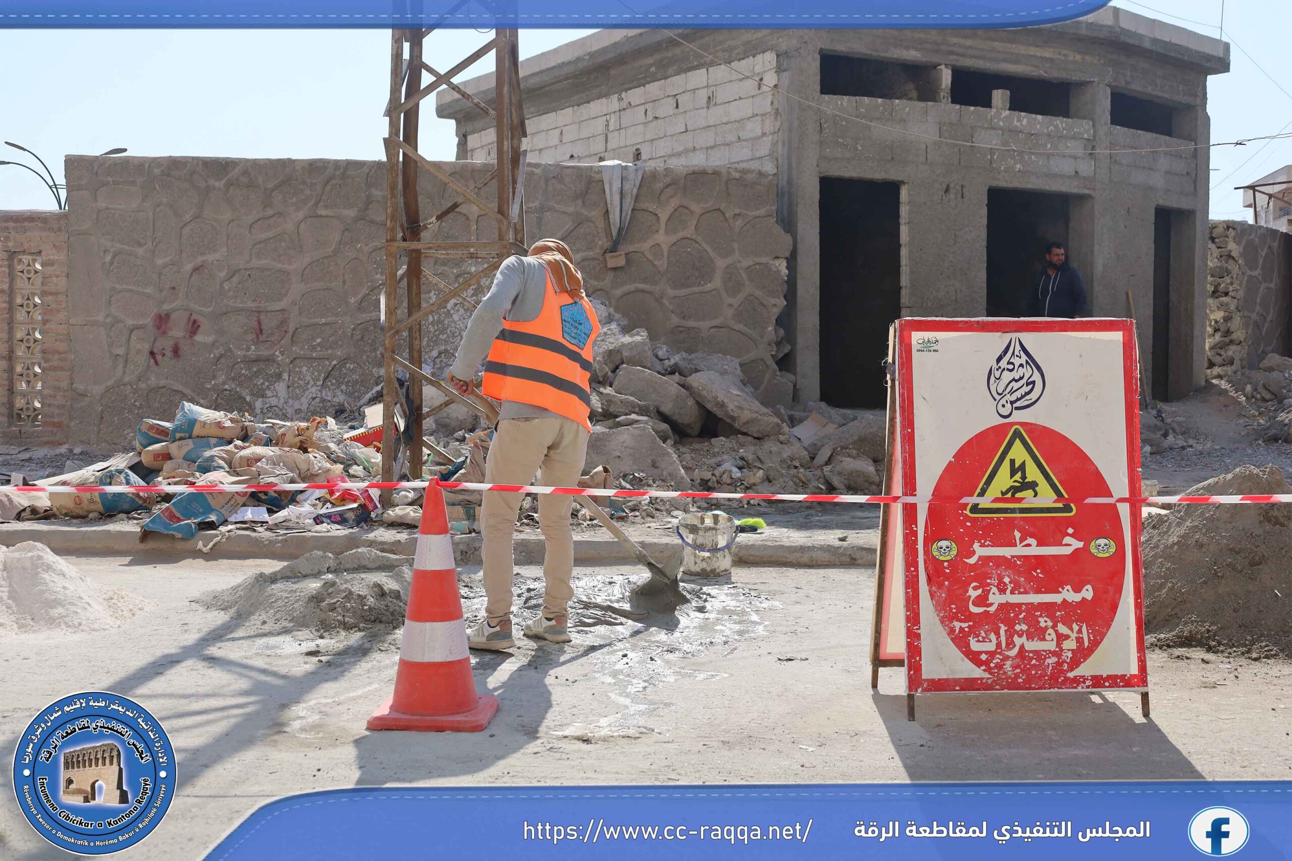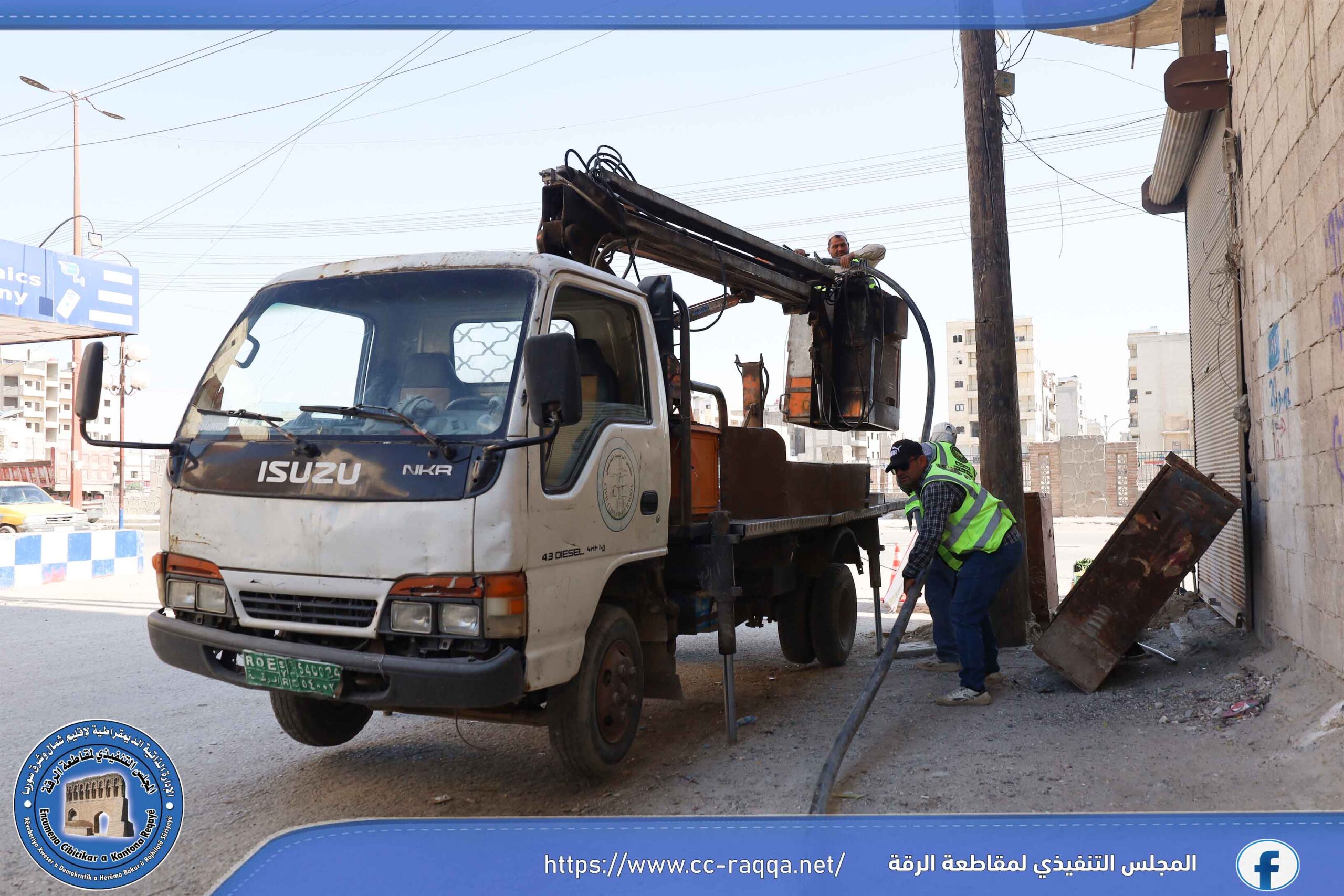 بعد الإنتهاء من فحص الكابلات الرئيسية وتركيب اللوحات الأرضية الرئيسية، والتي يصل عددها إلى ٢٠ لوحة أرضية، تقوم ورشة الكابلات الأرضية التابعة لهيئة الطاقة في مقاطعة الرقة، بالعمل على تركيب كابلات المنيوم معزولة (٤ × ٢٤٠) ملم عدد ٤ طول كل منها ١٥ متر للربط بين الشبكات الهوائية والأرضية، في كل من مركز الرقي والجو خدار.