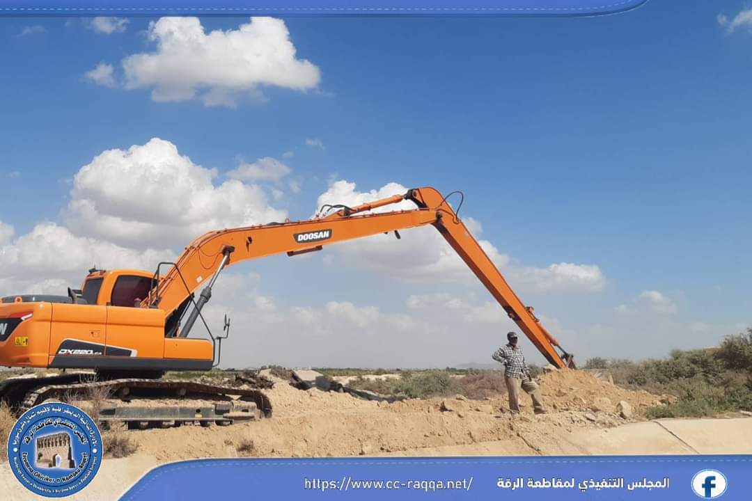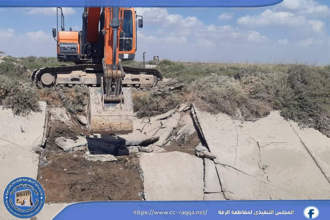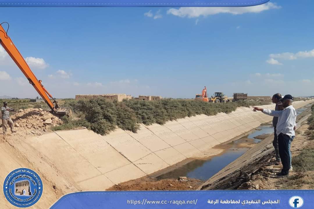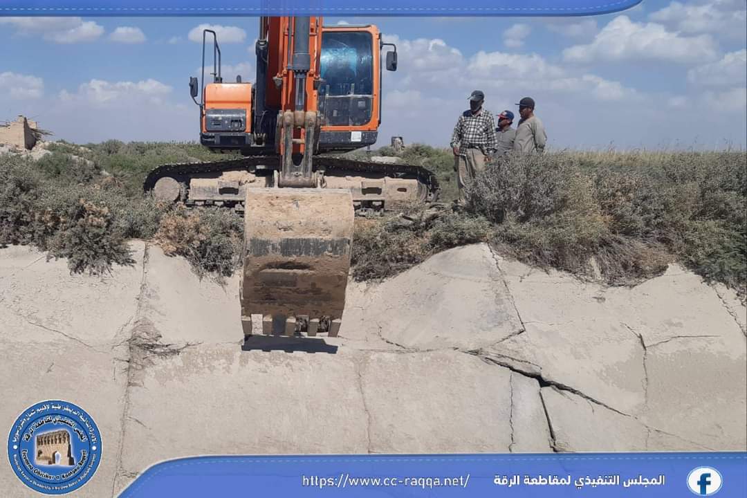 حيث تم حفر المقطع بشكل كامل وإزالة بقايا البلاط المكسر والتربة الرطبة جداً، والمباشرة بنقل تربة مخمرة ودحلها على شكل طبقات ولا يزال العمل مستمر حتى إجراء أعمال الصيانة للقناة المذكورة.