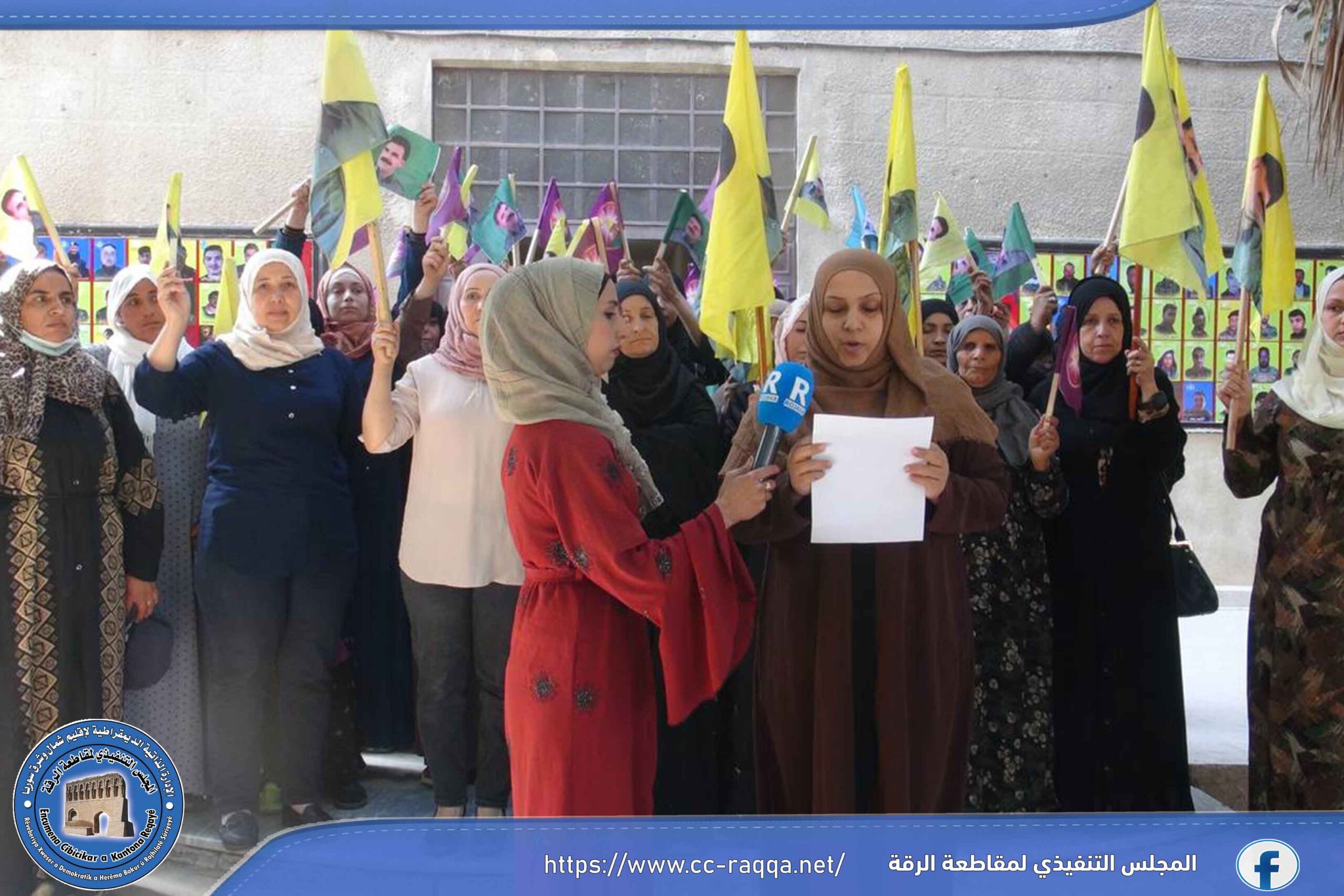 وعليه نحن مجلس المرأة في عوائل شهداء في مقاطعة الرقة ندين ونستنكر بشدة، المؤامرة الدولية المحاكاة ضد القائد وضد الشعوب التواقة للحرية والديمقراطية، ونطالب المجتمع الدولي والمنظمات الحقيقية والشعوب الحر بالوقوف إلى جانب القائد ومؤازرته في قضيته العادلة، والضغط على السلطات التركية لردها عن القيام بسياساتها الجائرة والظالمة بحق القائد والشعوب، ‏المطالبة بالحرية والأمن والاستقرار والسلام في كل مكان.