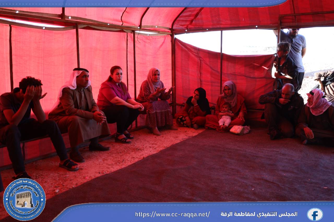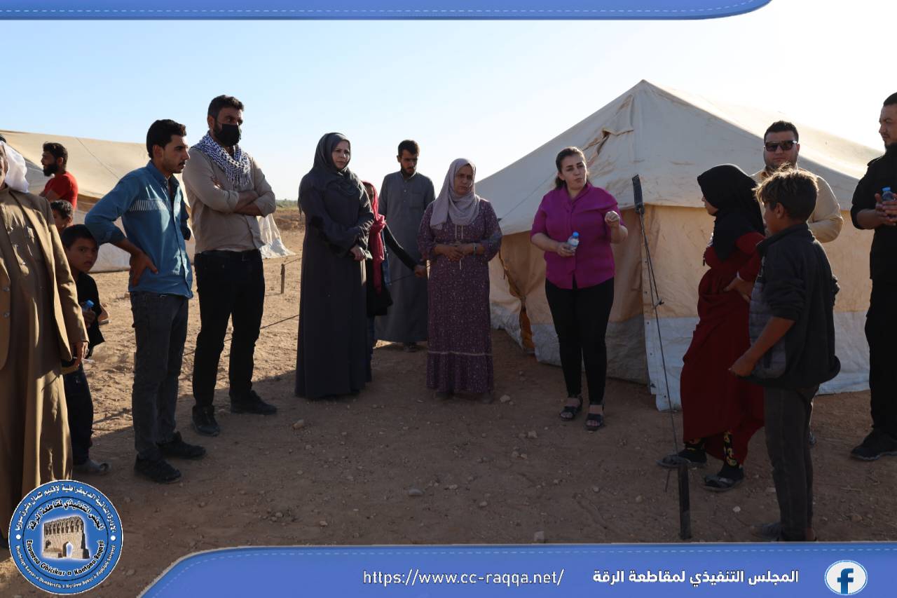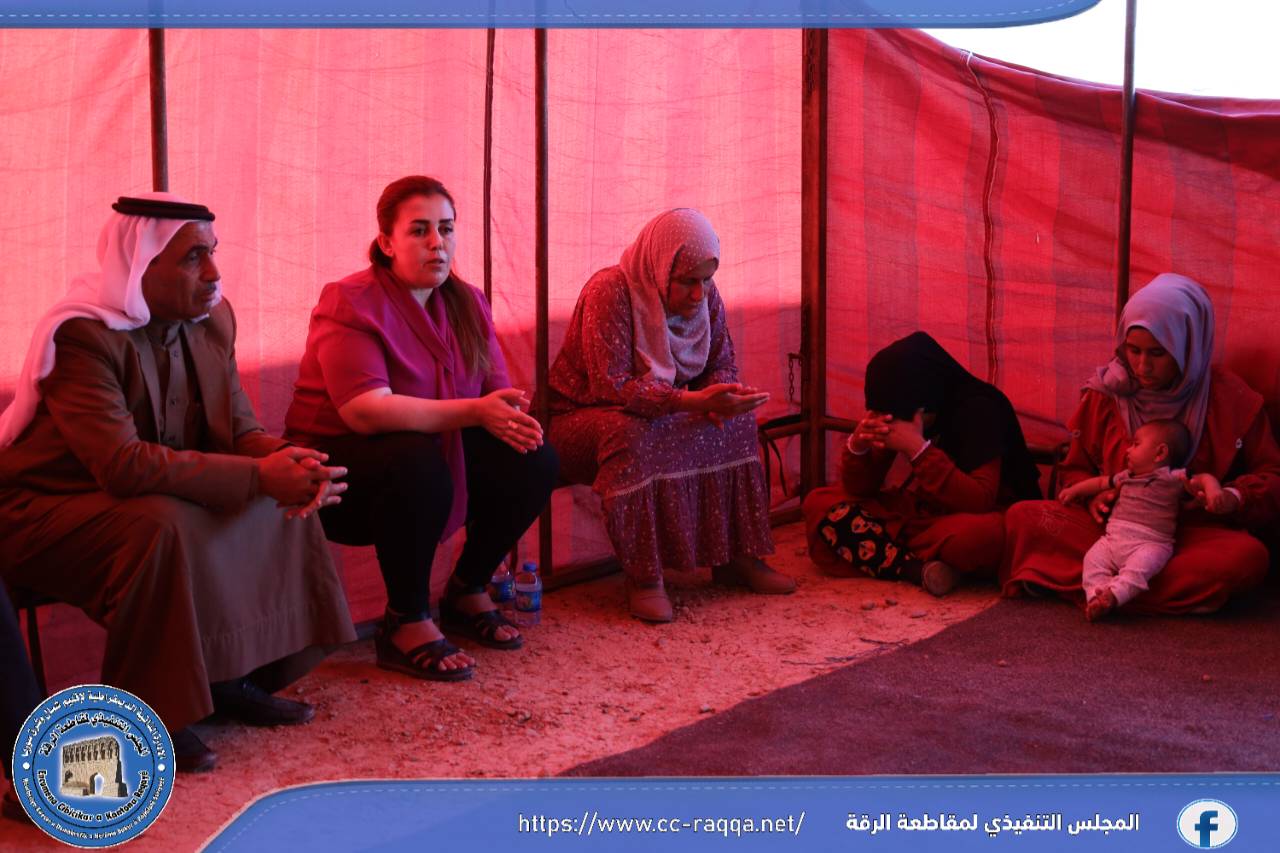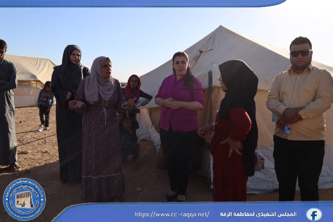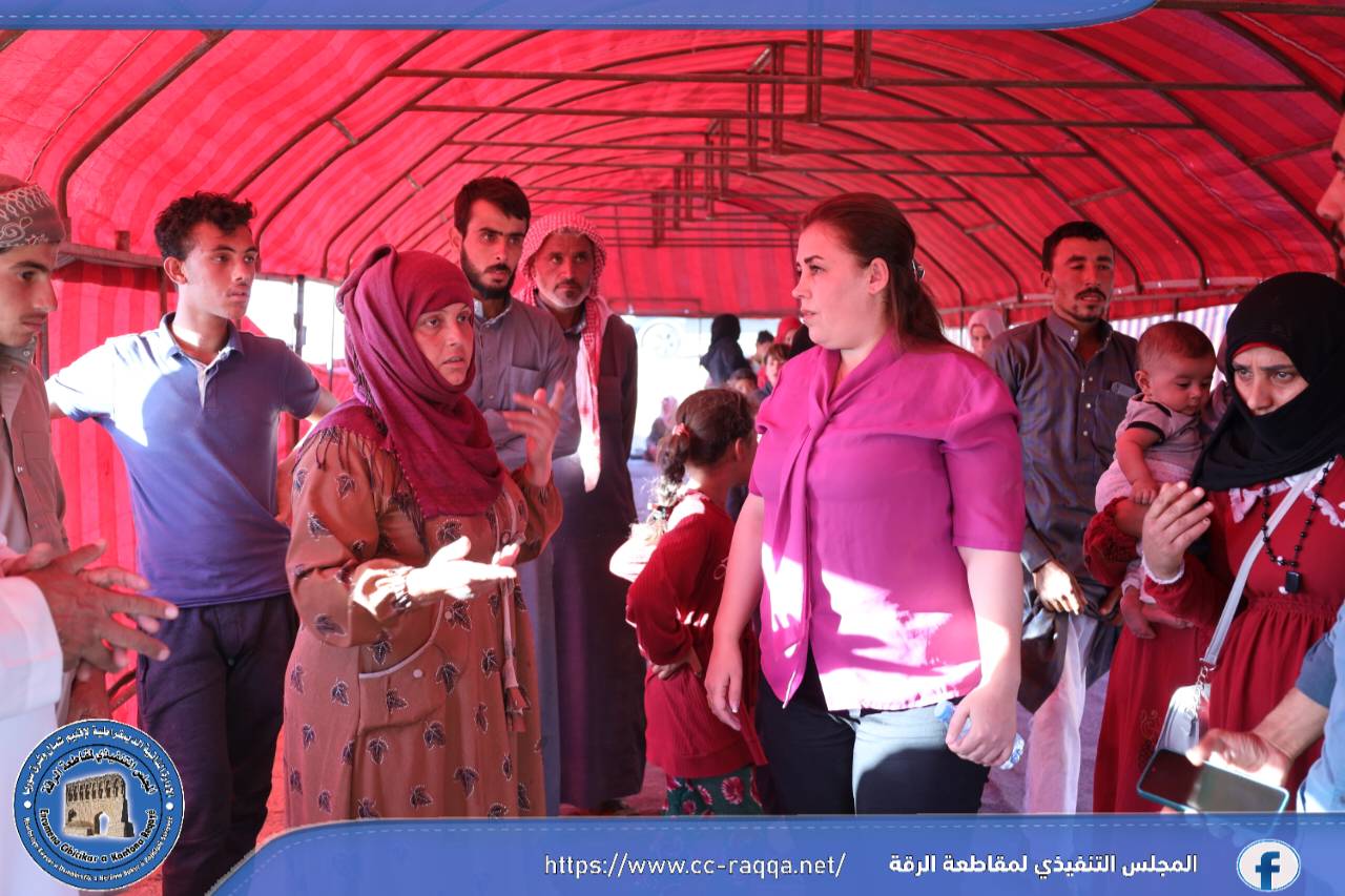 زار وفد مؤلف من الرئيسة المشتركة للمجلس التنفيذي في مقاطعة الرقة الآنسة “هيڤين اسماعيل” وهيئة الشؤون الاجتماعية والكادحين في إقليم شمال وشرق سوريا وهيئة الشؤون الاجتماعية والكادحين في مقاطعة الرقة عصر اليوم 6 تشرين الأول، مخيم العدنانية بريف الرقة الغربي، بهدف الاطلاع على واقع الأهالي النازحين من المناطق اللبنانية جراء الحـ.ـرب الحاصلة هناك.