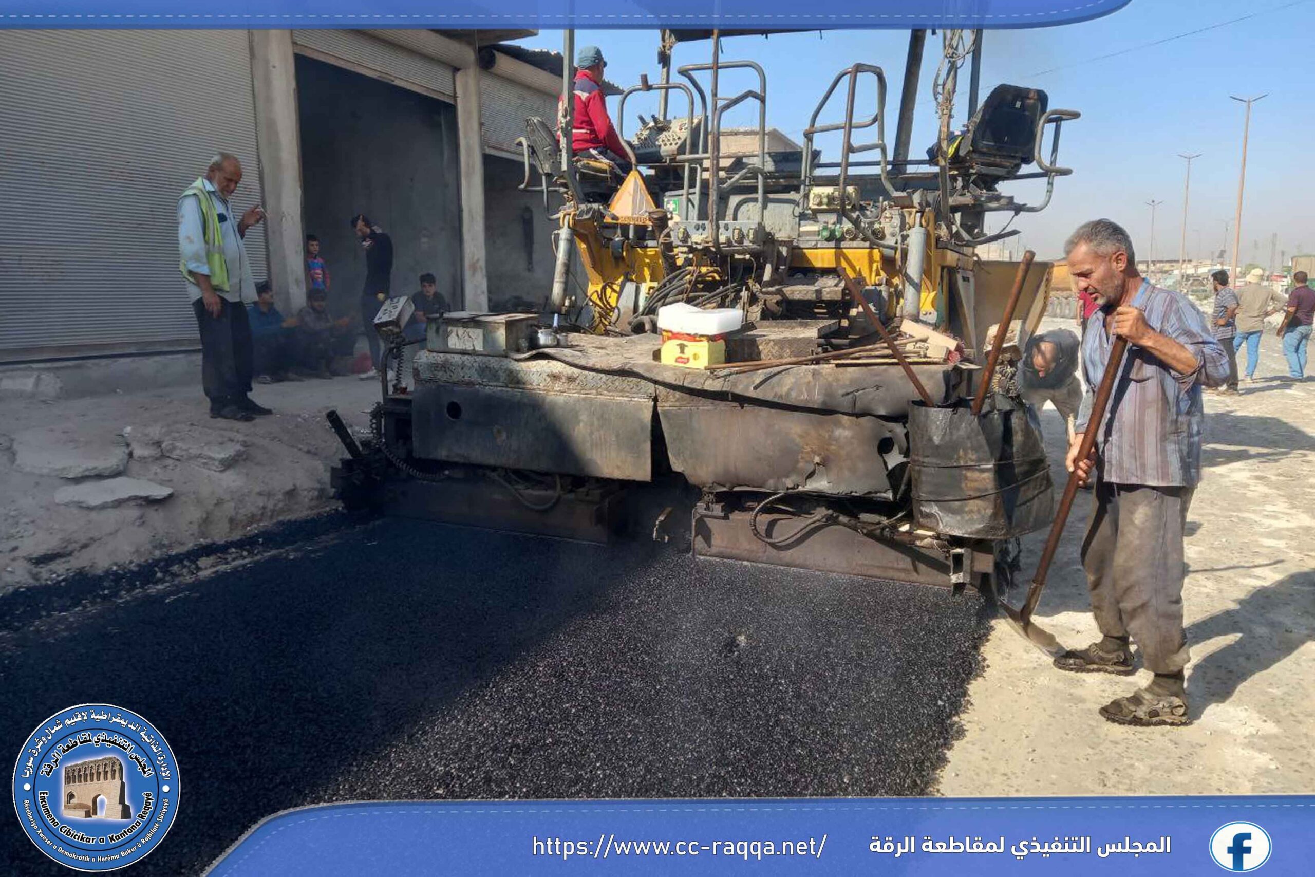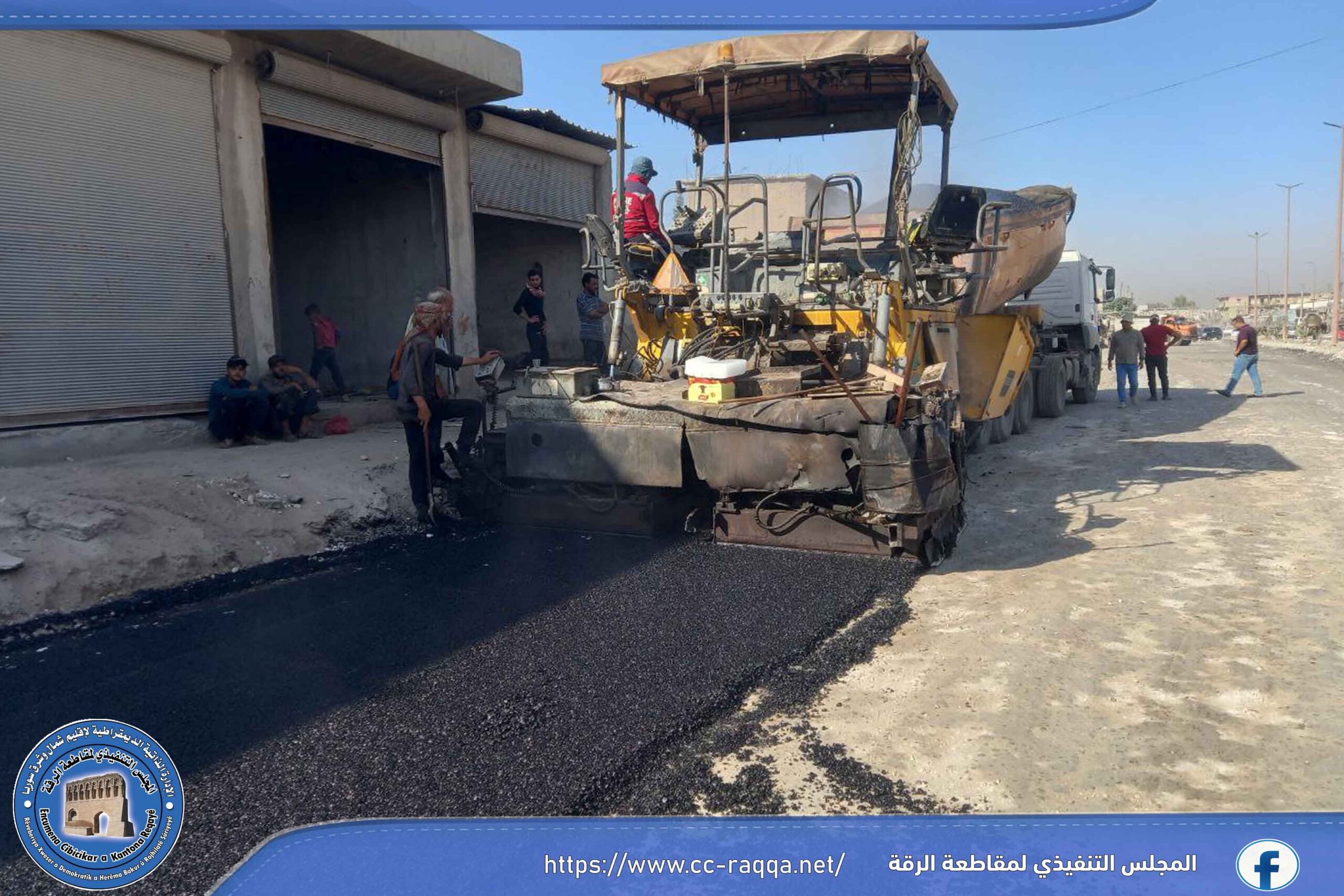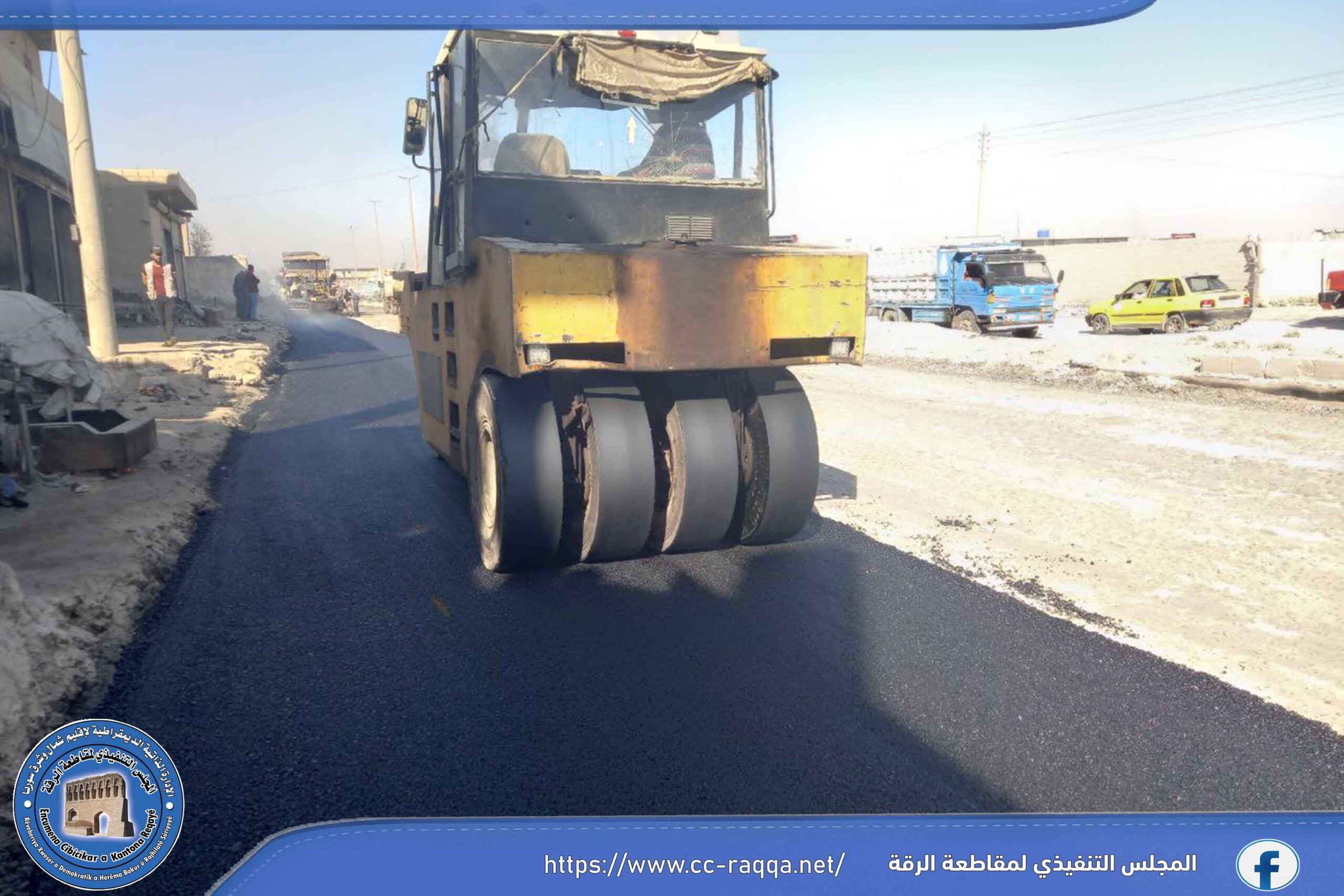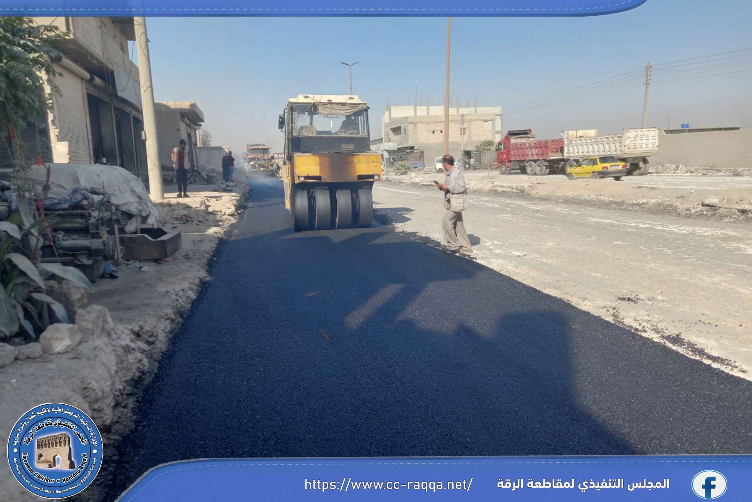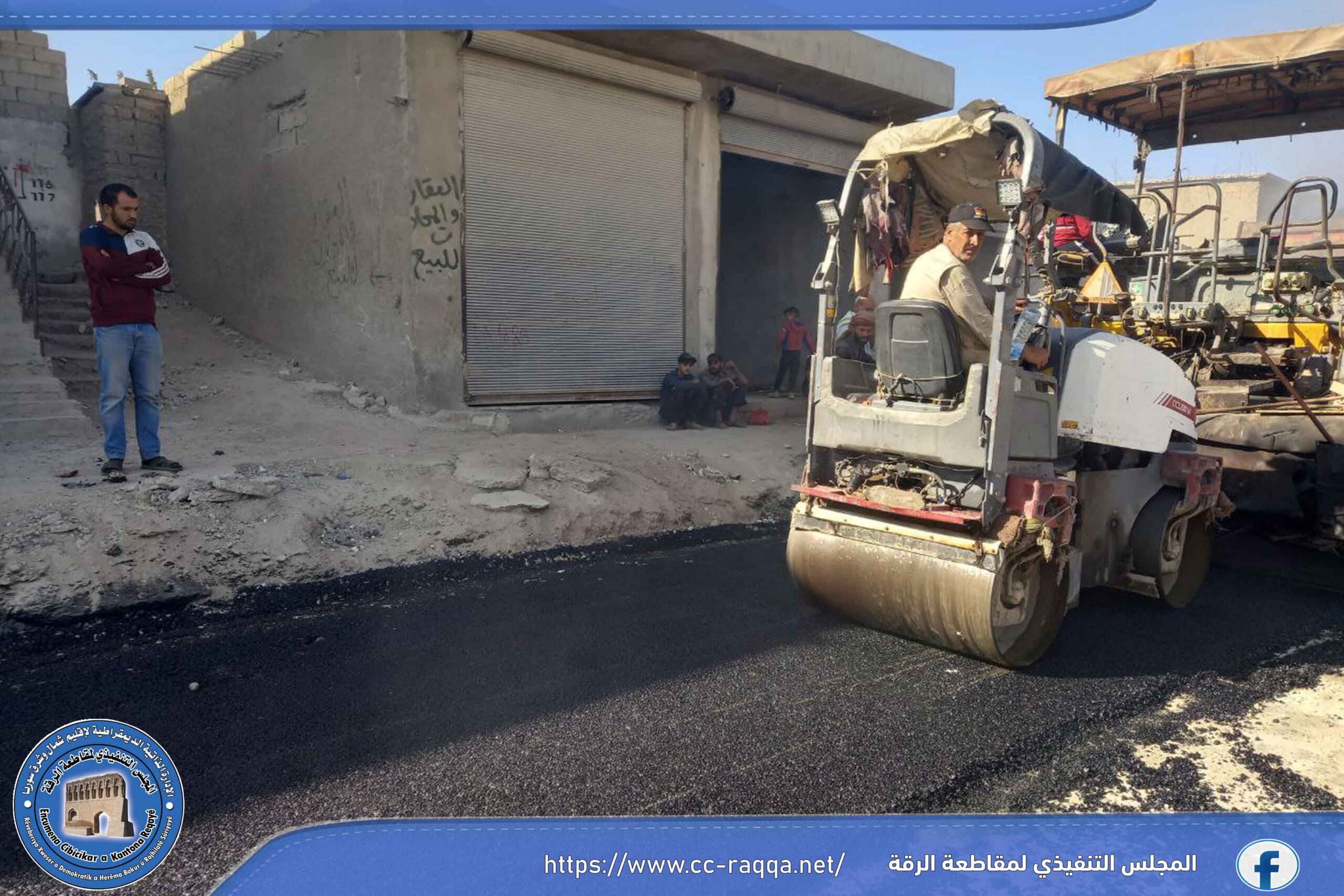 تستمر الورش التابعة لبلدية الشعب في الرقة، بالعمل على تعبيد وإصلاح الكورنيش الشمالي لحي المشلب، والممتد من مفرق سوق الحديد حتى طريق دير الزور، بطول 2 كم ذهاباً و2 كم إياباً وعرض 12 متر لكل اتجاه، ولذلك عن طريق مد طبقة من مادة المجبول الإسفلتي بسماكة 14 سم على مرحلتين.