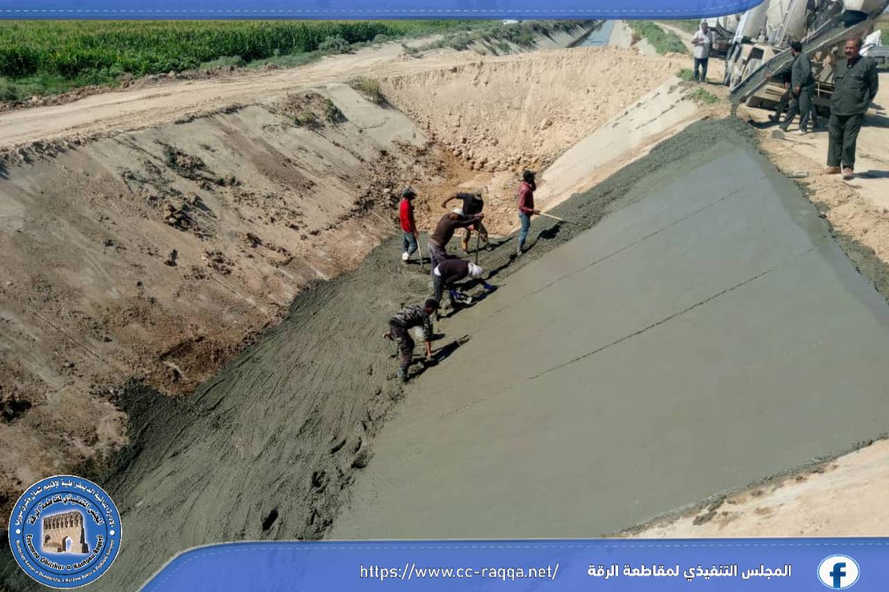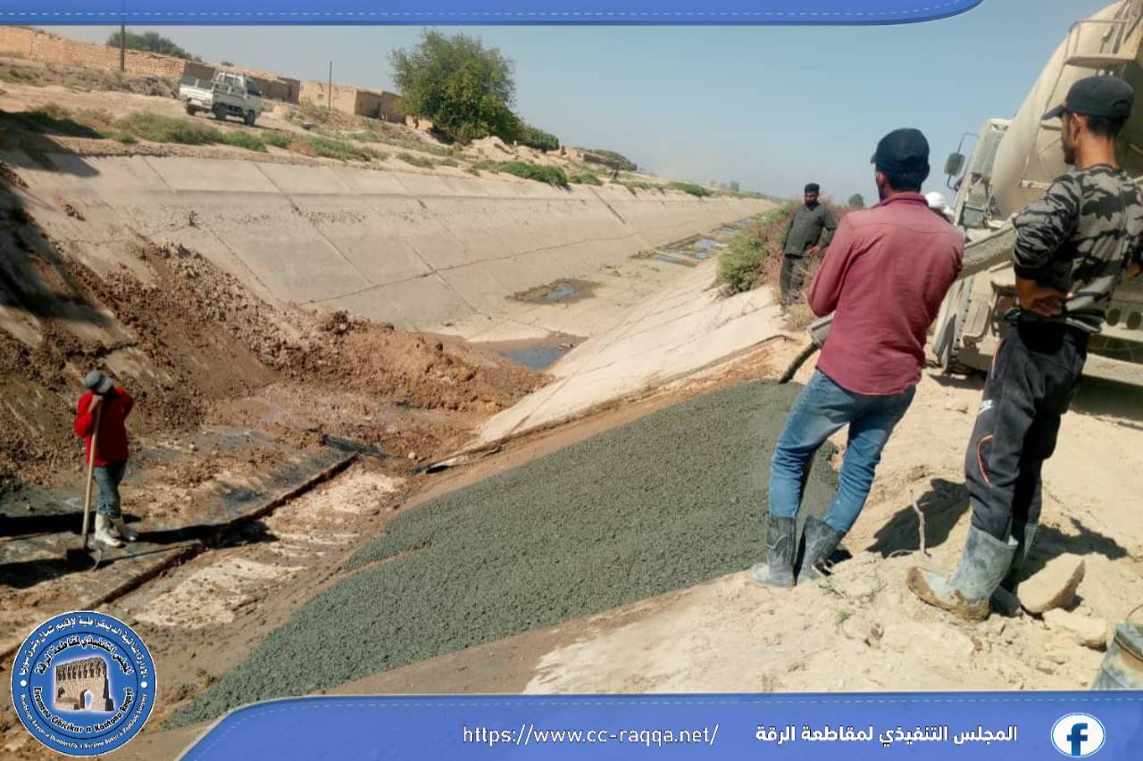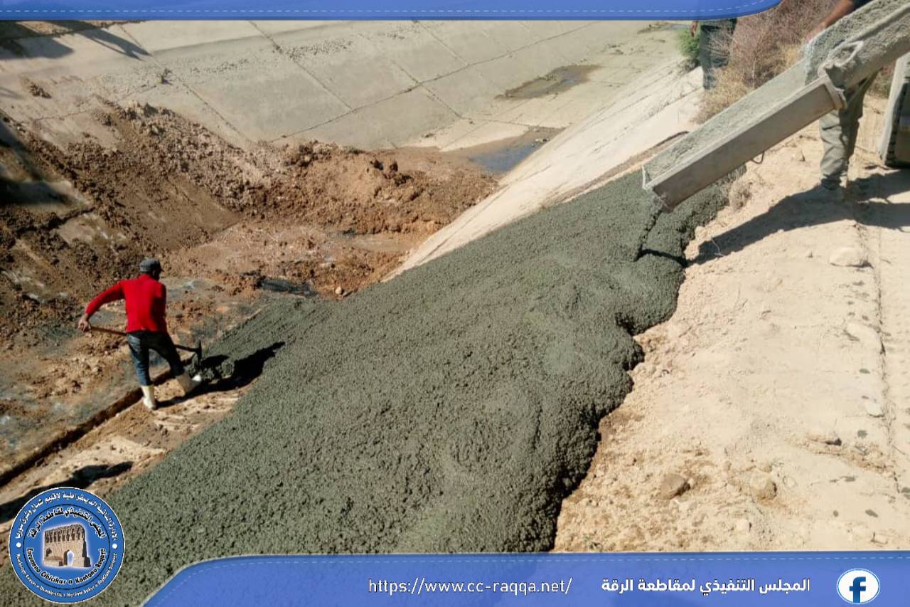 بعد انتهاء أعمال الردم في قناة الضفة اليمنى، تم المباشرة بأعمال التشذيب والسكربة، حيث تم إكساء المقطع المتضرر بكمية بيتون 25 متر مربع عيار 300، بالإضافة إلى إملاء الفواصل بمادة بيتومين S 10.
