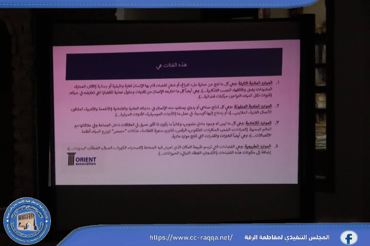نظمت كل من هيئة الثقافة في إقليم شمال وشرق سوريا وهيئة الثقافة والآثار في مقاطعة الرقة وبالتعاون مع جمعية الشرق لحماية التراث السوري مساء اليوم 12 تشرين الأول، محاضرة بعنوان (الخرائط الثقافية تجربة ميدانية من الرقة) ،من إلقاء الأستاذ “أحمد الهشلوم”، وذلك في المكتبة الوطنية، وبحضور اتحاد المثقفين وعدد من والأدباء والمثقفين.