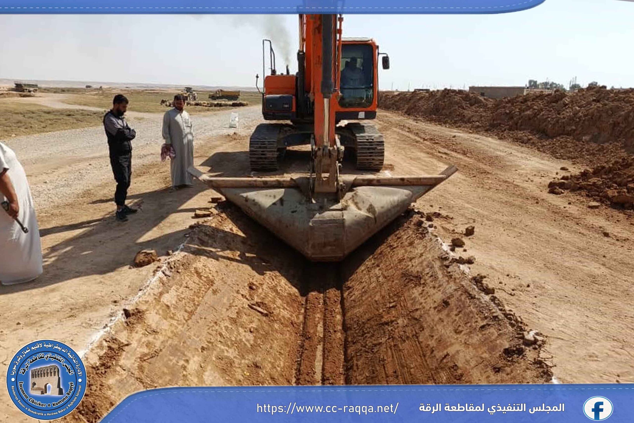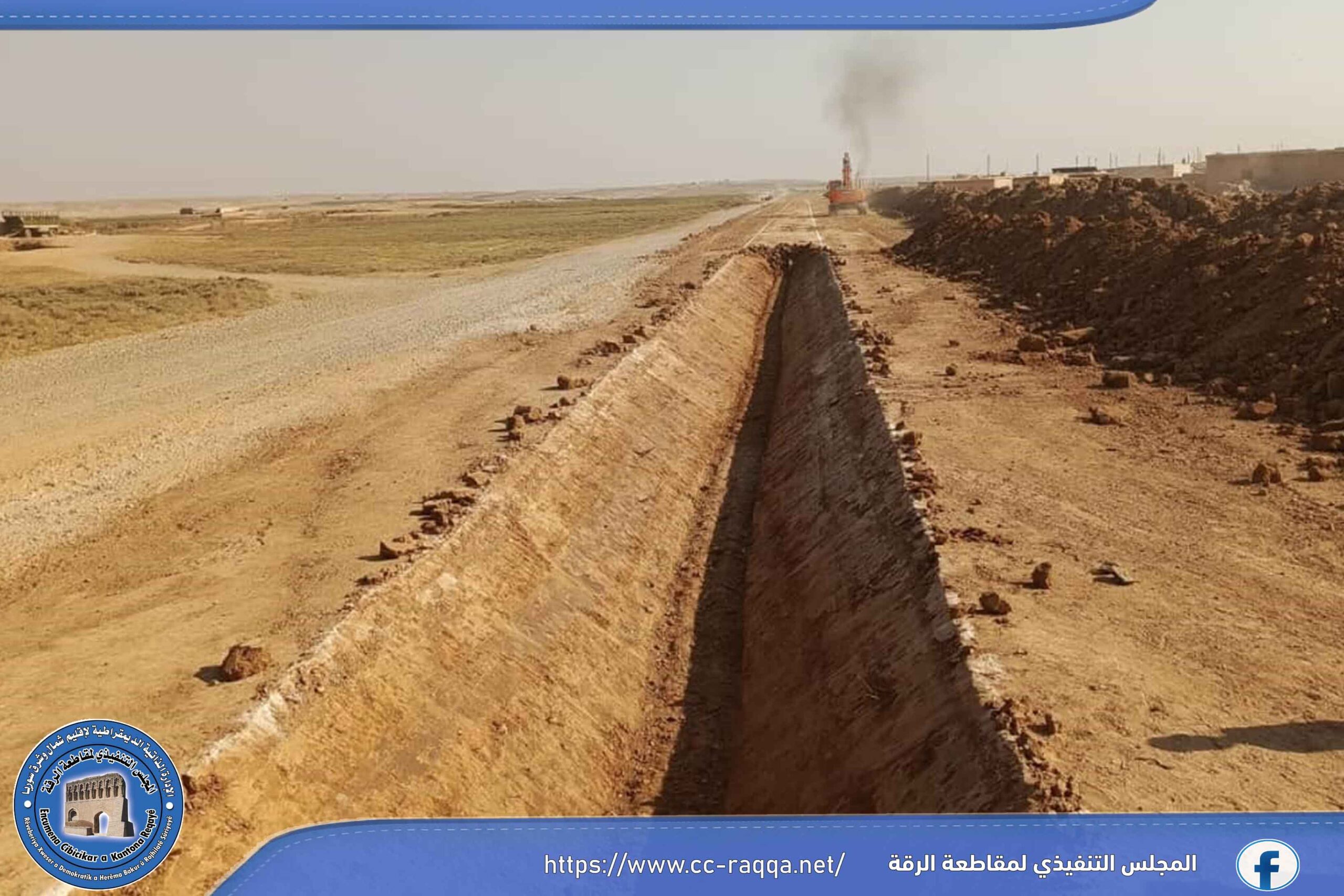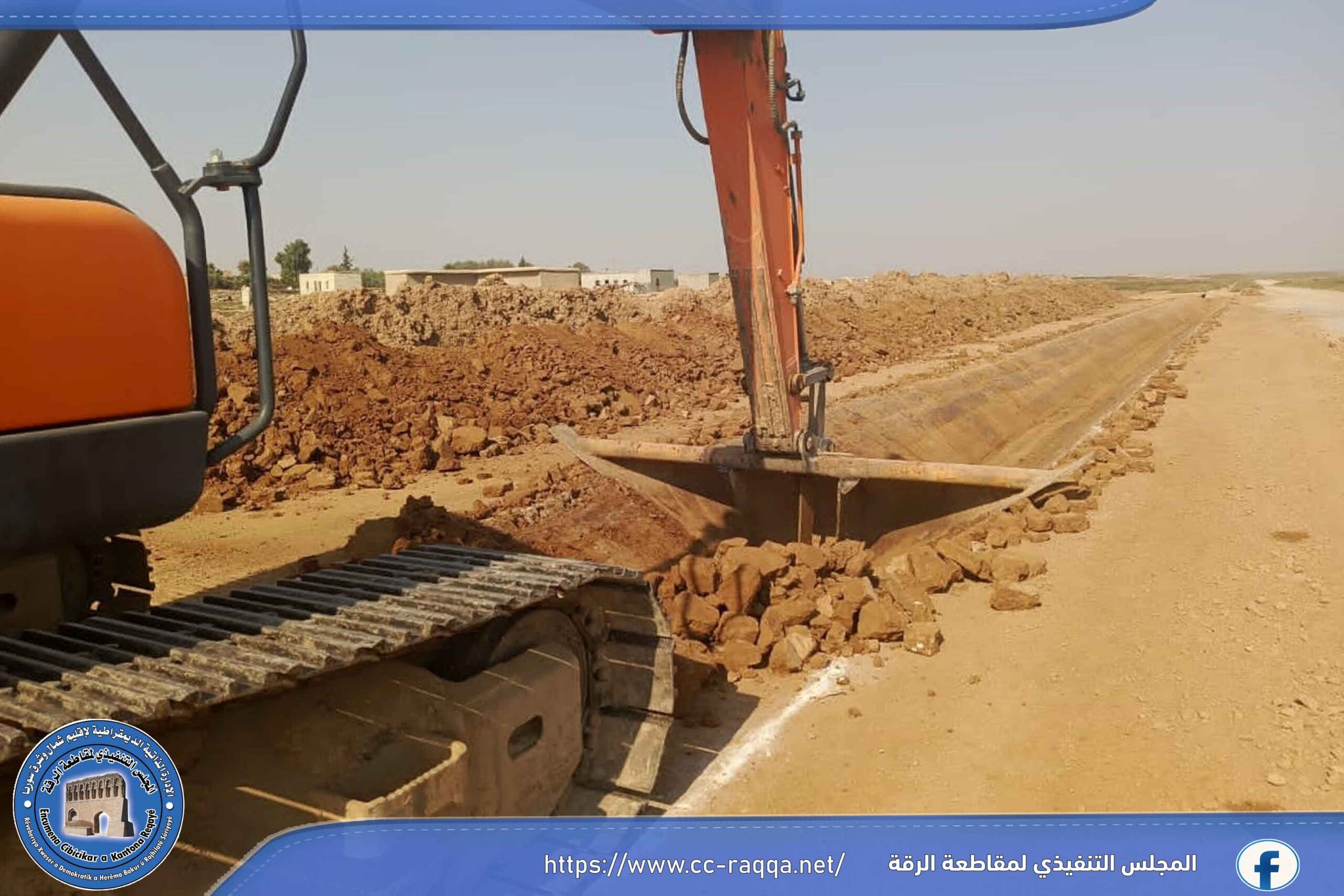بعد انتهاء أعمال الحفر في قناة TJ في موقع قرية الأندلس بريف الرقة الغربي، وإزالة بقايا البلاط المتضرر والتربة الرطبة جداً، تمت المباشرة بأعمال الردم ونقل تربة مخمرة بكمية تقريبية 4 آلاف متر مكعب، ودحل المقطع المتضرر على شكل طبقات بواسطة مدحلة أرجل غنم، بحيث لم تتجاوز سماكة الطبقة 25 سم.