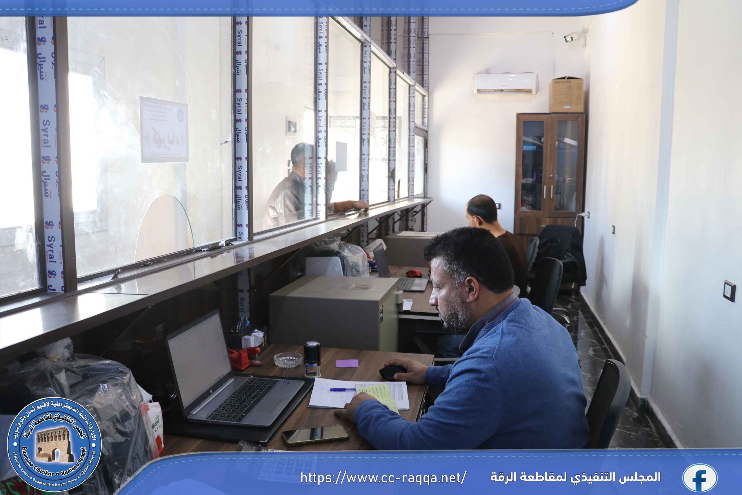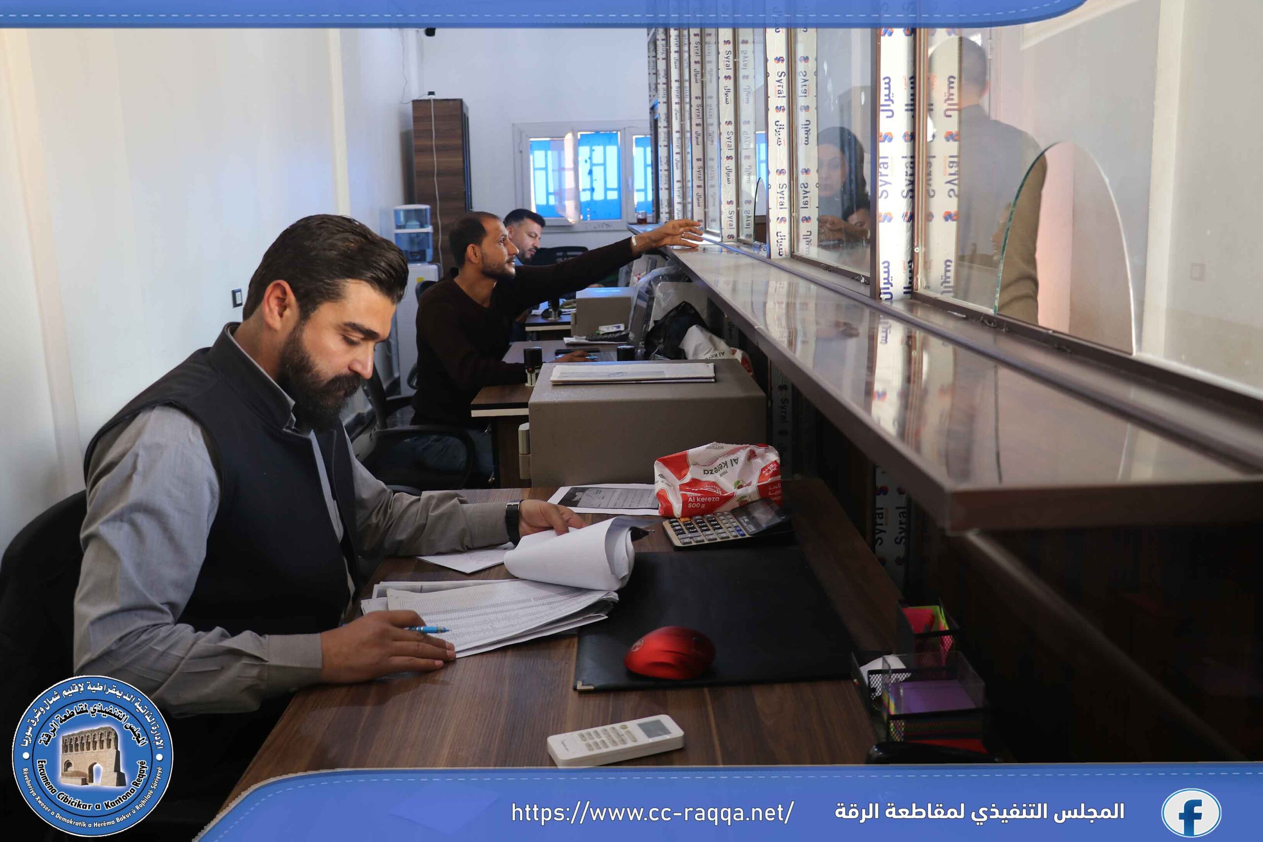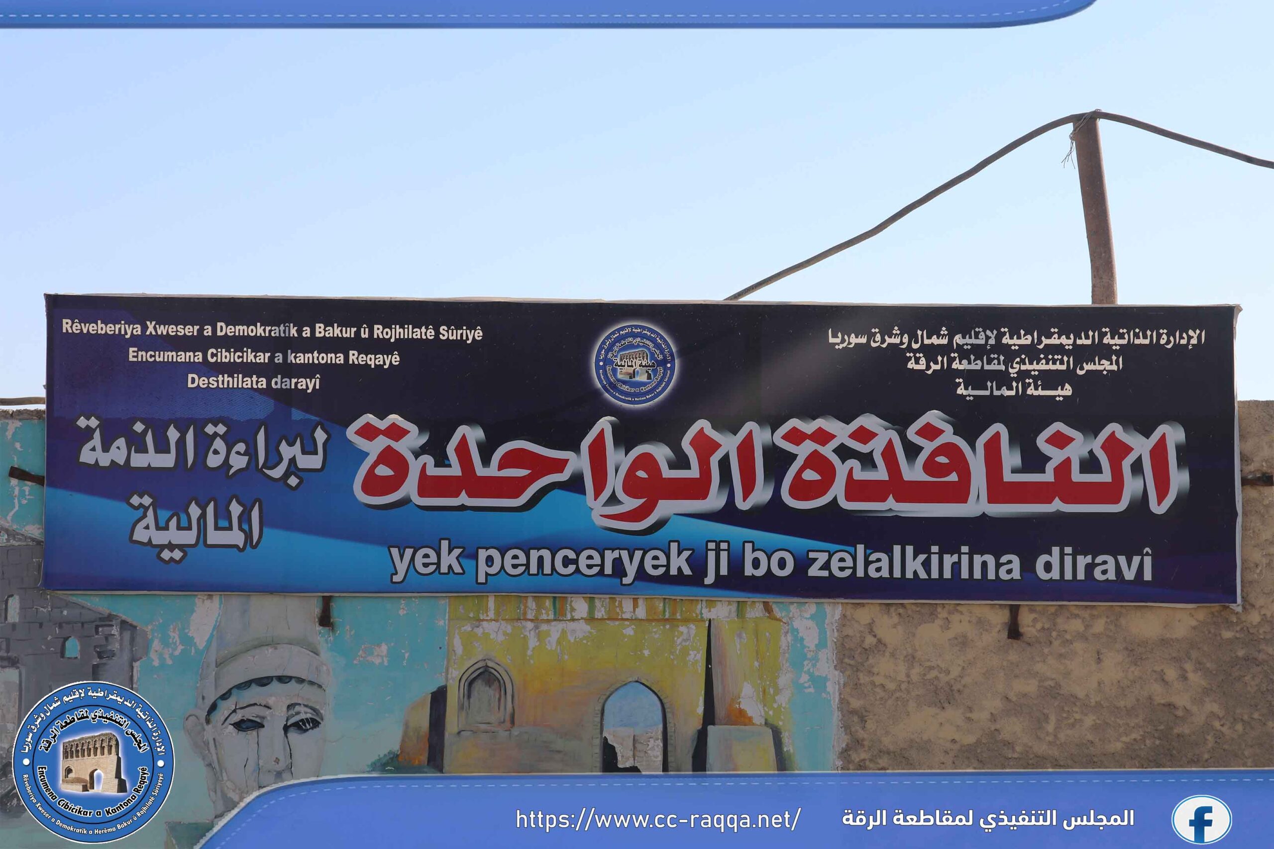 يعمل مكتب النافذة الواحدة التابع لهيئة المالية في مقاطعة الرقة، على استقبال جميع المراجعين لاستخراج براءة الذمة المالية، والذي يتألف من 4 نوافذ وهي (البلدية _ الكهرباء _ المياه _ الري).