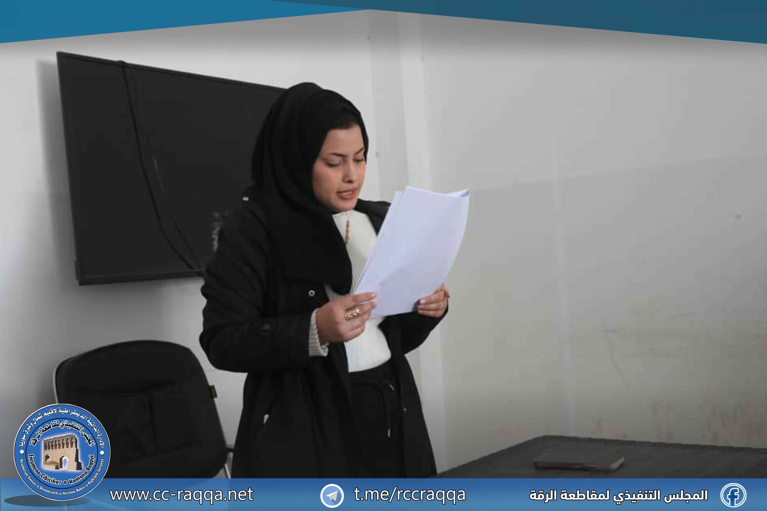 في إطار حملة مناهضة العـ.ـنف ضـ.ـد المرأة، نظمت هيئة الشباب والرياضة صباح اليوم 21 تشرين الثاني، محاضرتين تحت عنوان (لا للعـ.ـنف ضـ.ـد المرأة)، كانت الأولى في صالة الأنشطة الشبابية بملعب الرقة البلدي، بحضور العاملات في الهيئة والنساء والشابات ضمن الدورات التدريبية المقامة، وكانت المحاضرة الثانية لعدد من أهالي مزرعة يعرب بريف الرقة الغربي.