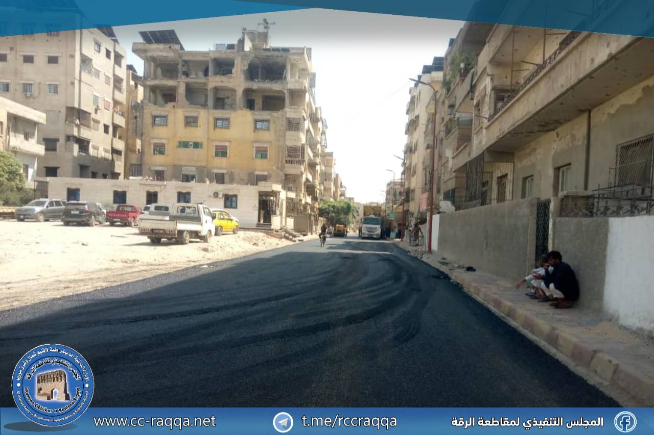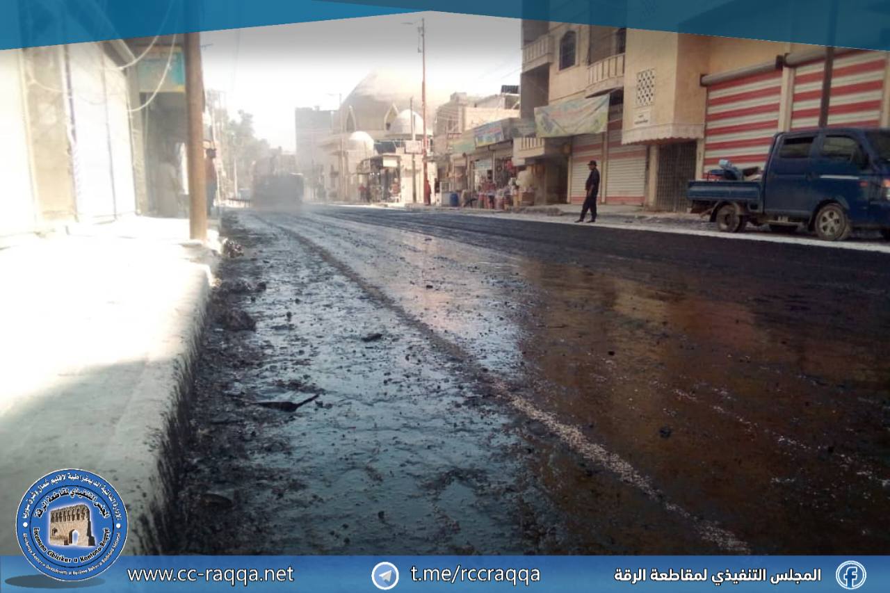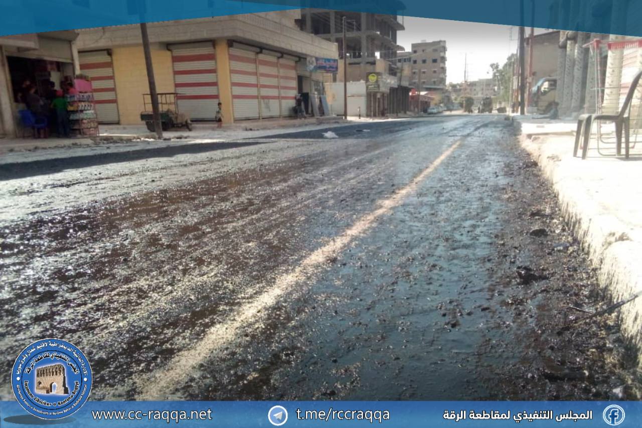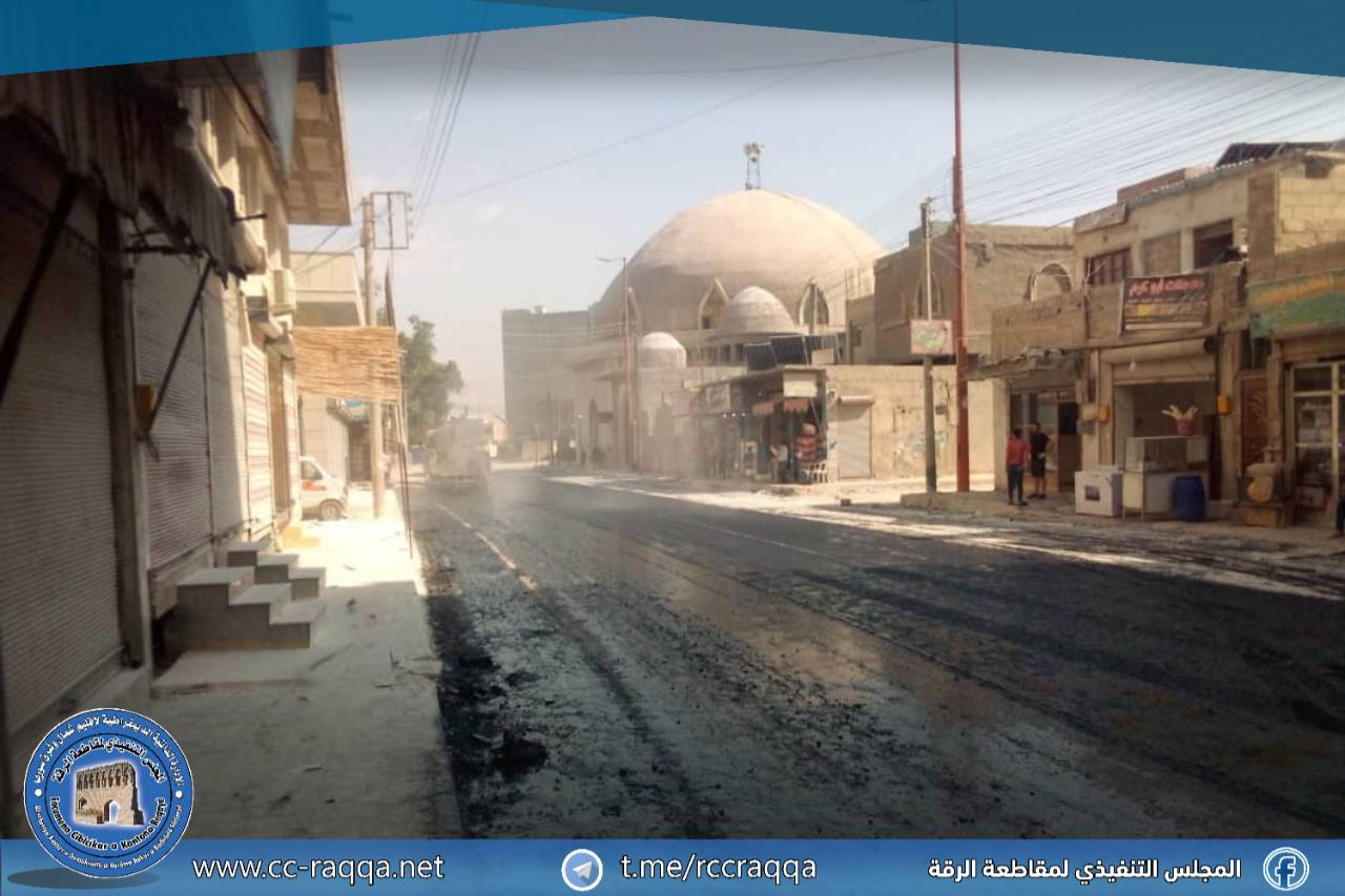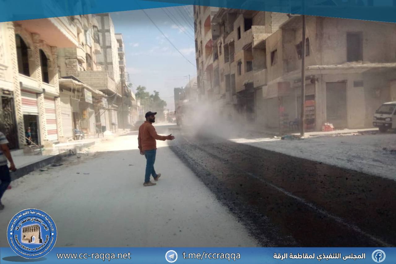 بدأت بلدية الشعب في مدينة الرقة صباح اليوم 9 آب، أعمال رش مادة الـ MC 0 في شوارع حي الفردوس، وذلك بعد الانتهاء من تجهيز الطرقات في الحي ومد مادة الكرابية تمهيداً لعملية التعبيد.