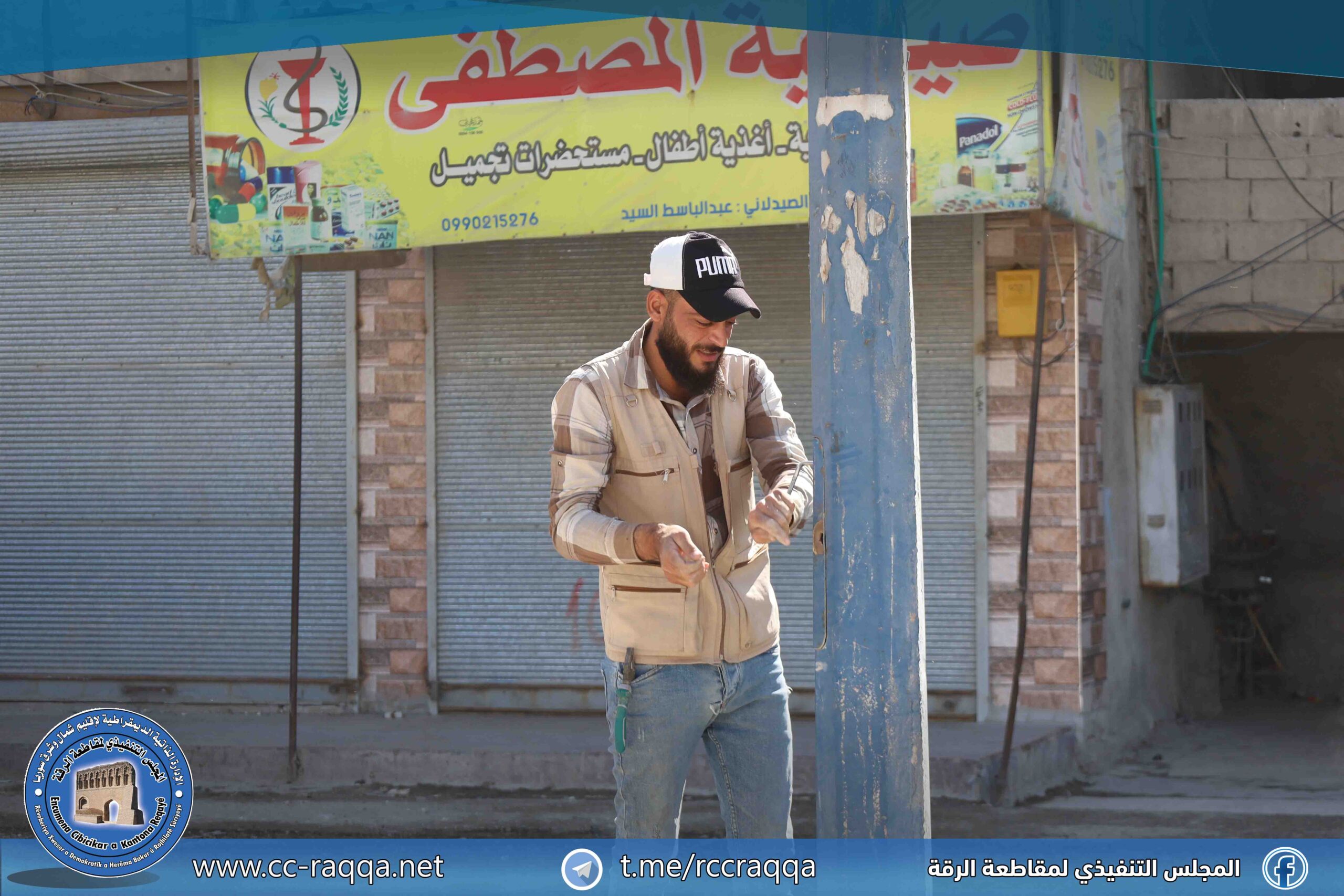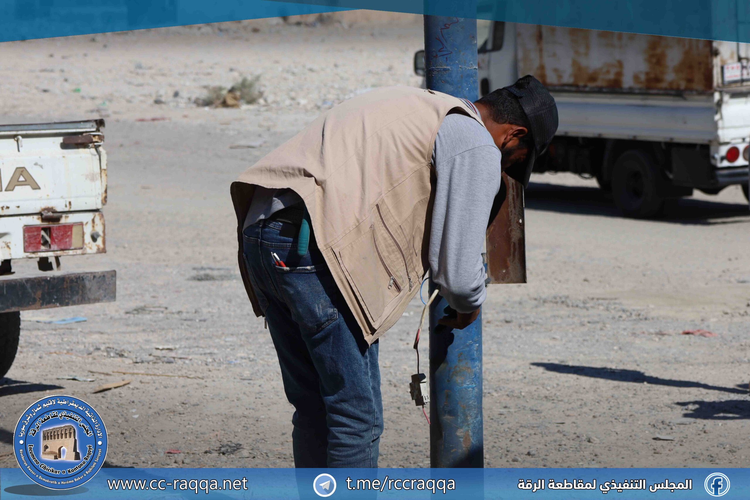 في إطار الجهود المبذولة لتحسين الإنارة الليلية، تواصل ورشات قسم الإنارة التابعة لبلدية الشعب في الرقة صباح اليوم 6 أيلول، أعمالها في إصلاح أعمدة الإنارة العامة في حي الادخار.