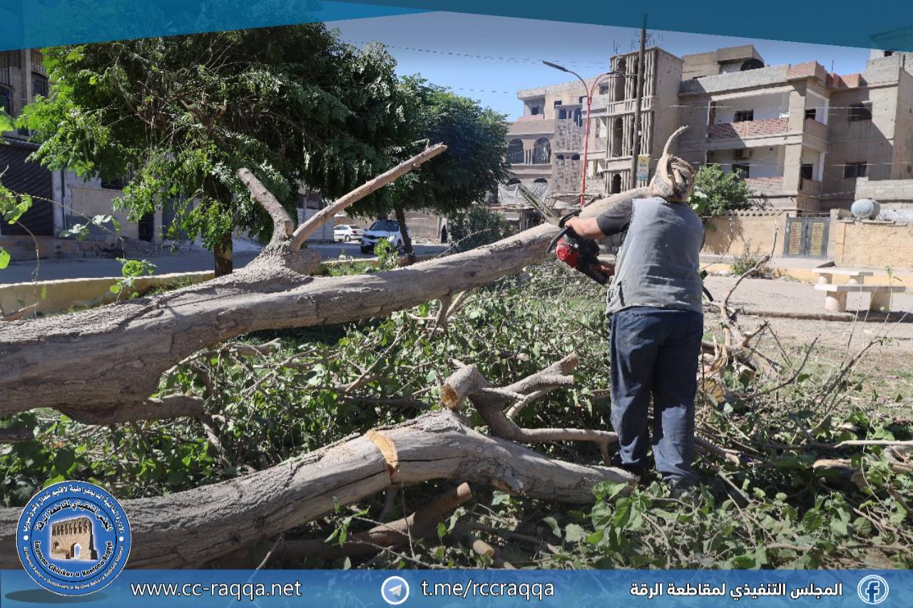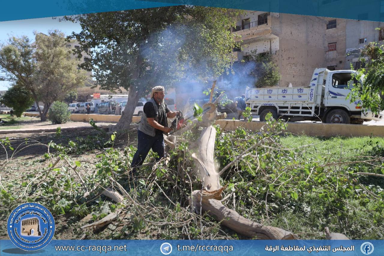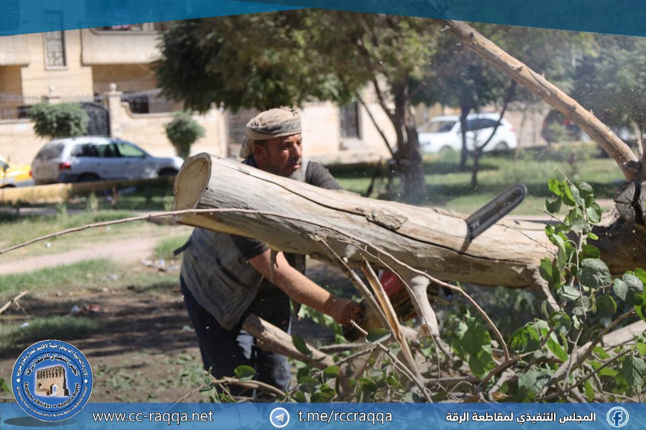 بدأت دائرة الحدائق والتشجير في بلدية الشعب بالرقة، حملة لإزالة الأشجار اليابسة من الحدائق العامة، في خطوة تهدف إلى تحسين المشهد الحضري وتعزيز المساحات الخضراء في المدينة.
