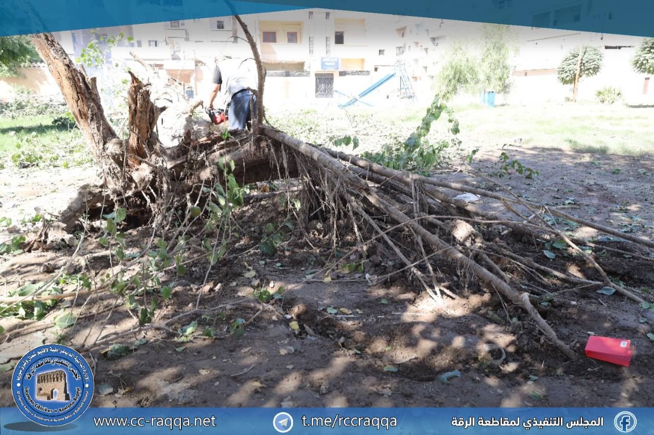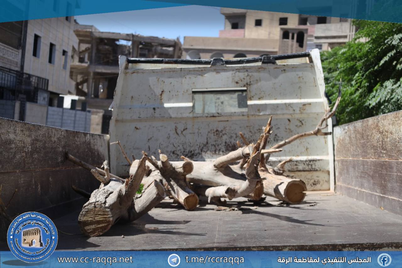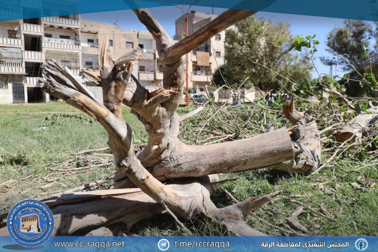 بدأت دائرة الحدائق والتشجير في بلدية الشعب بالرقة، حملة لإزالة الأشجار اليابسة من الحدائق العامة، في خطوة تهدف إلى تحسين المشهد الحضري وتعزيز المساحات الخضراء في المدينة.