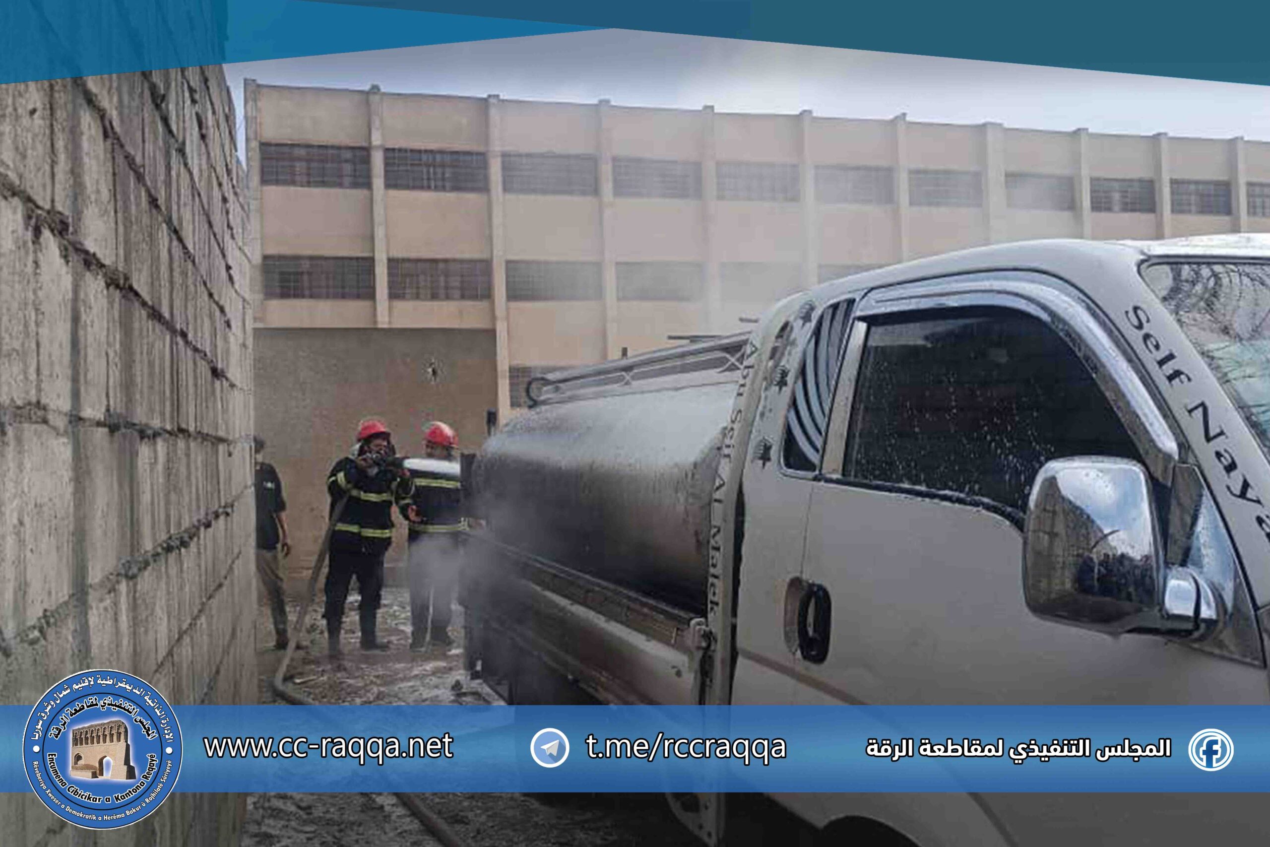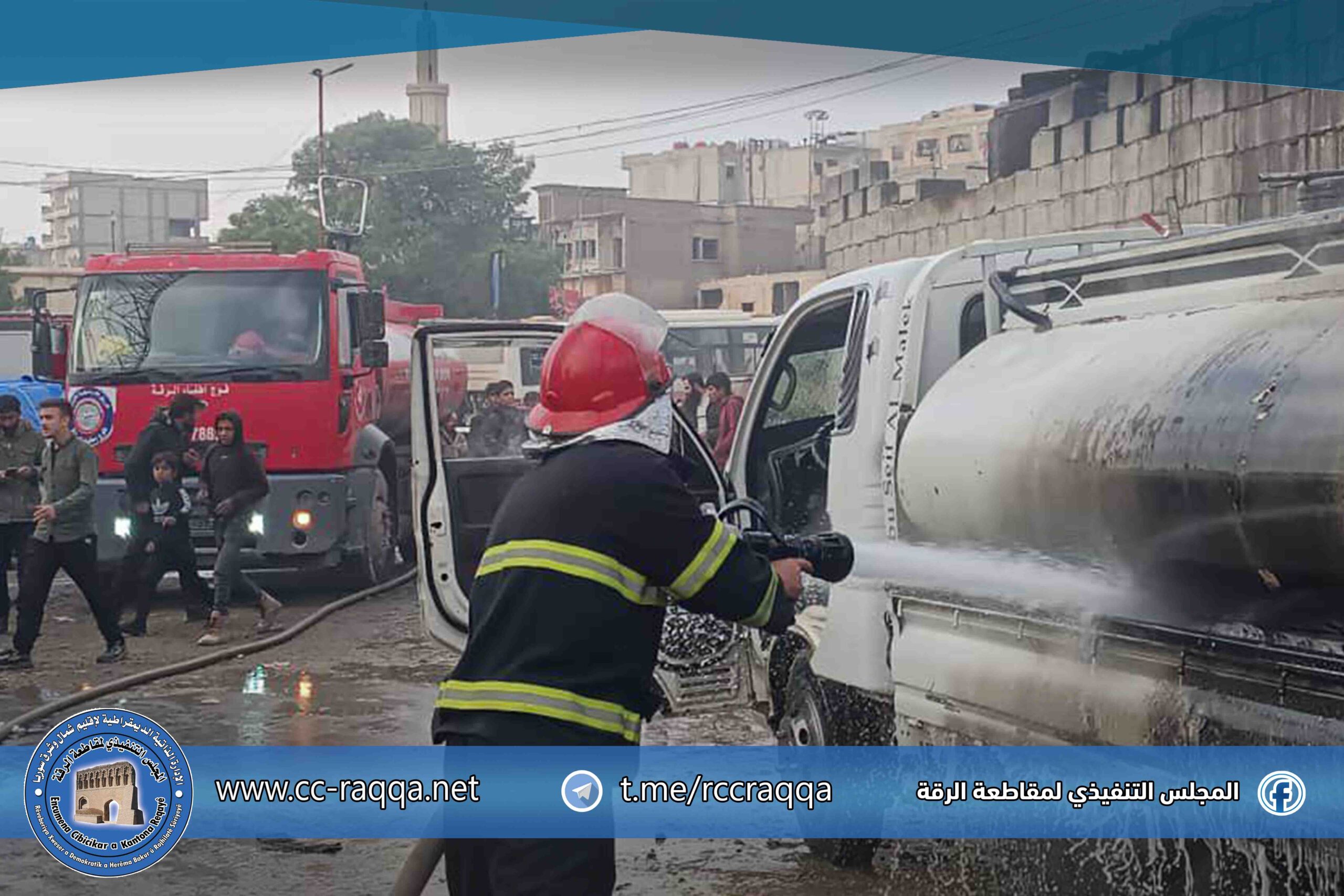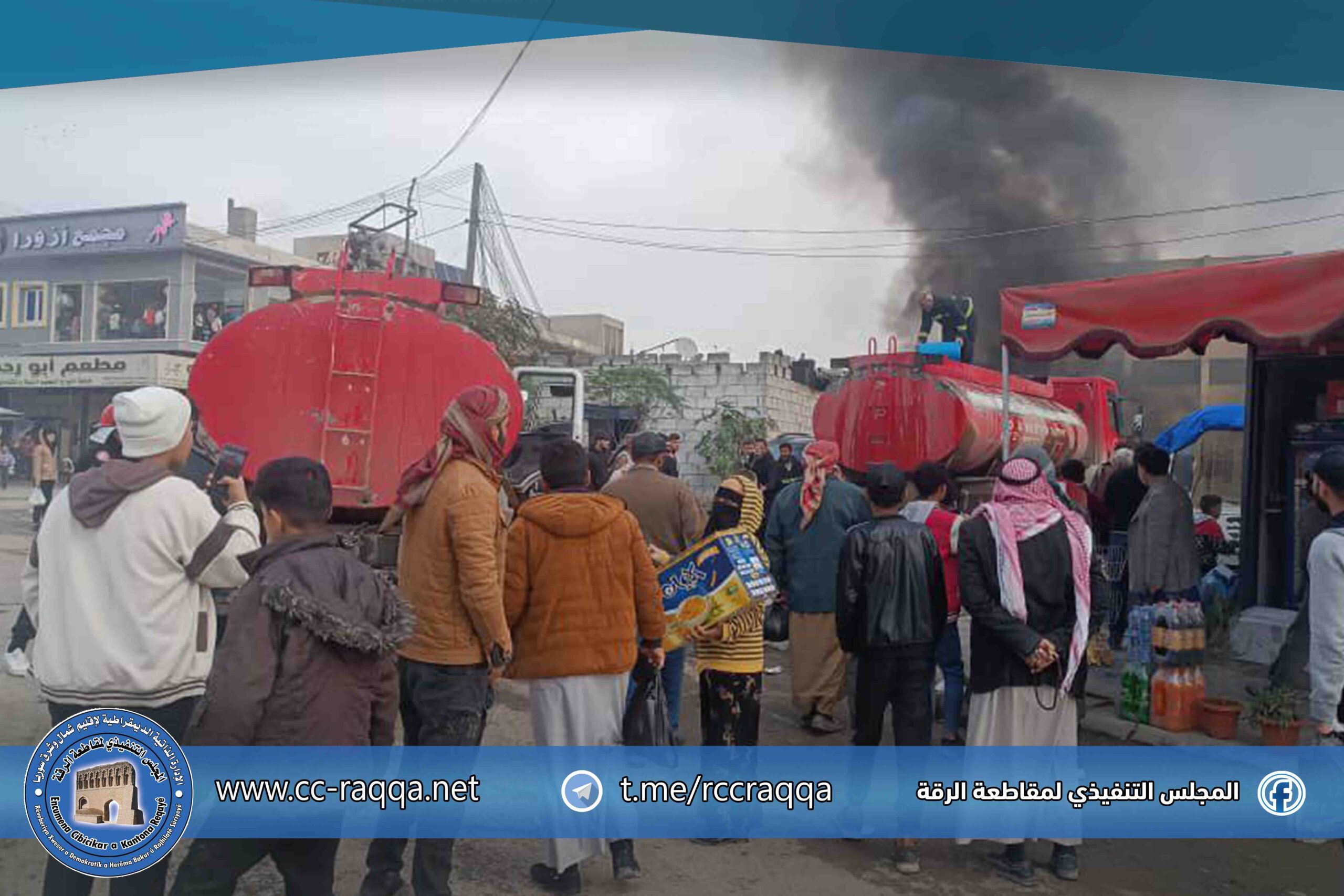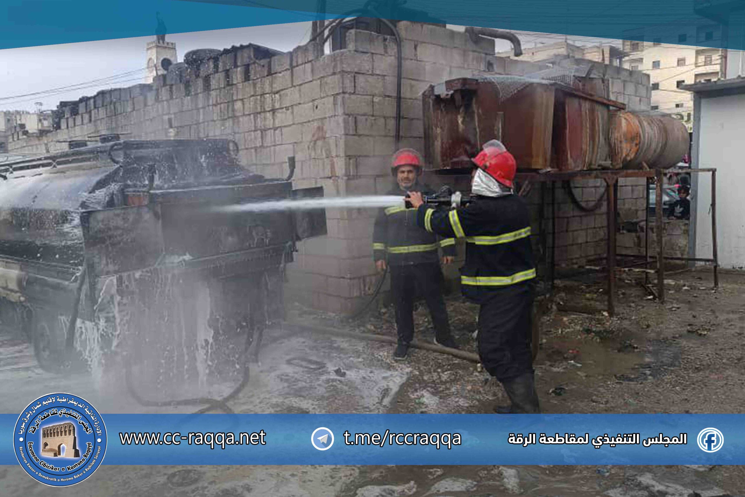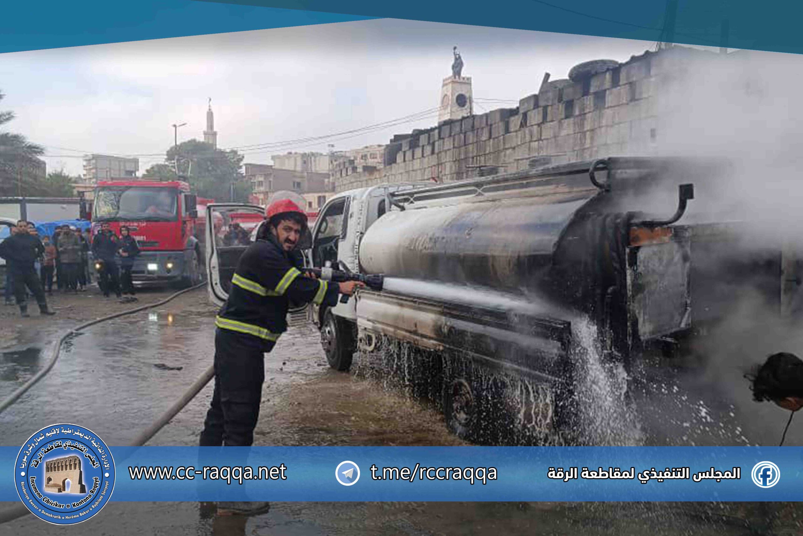 تمكّن فريق الاستجابة الأولية ظهر اليوم 16 تشرين الثاني، من إخماد حريق اندلع في صهريج مازوت عند دوار الساعة في مدينة الرقة، نتيجة ماس كهربائي وقع أثناء عملية تفريغ المادة.